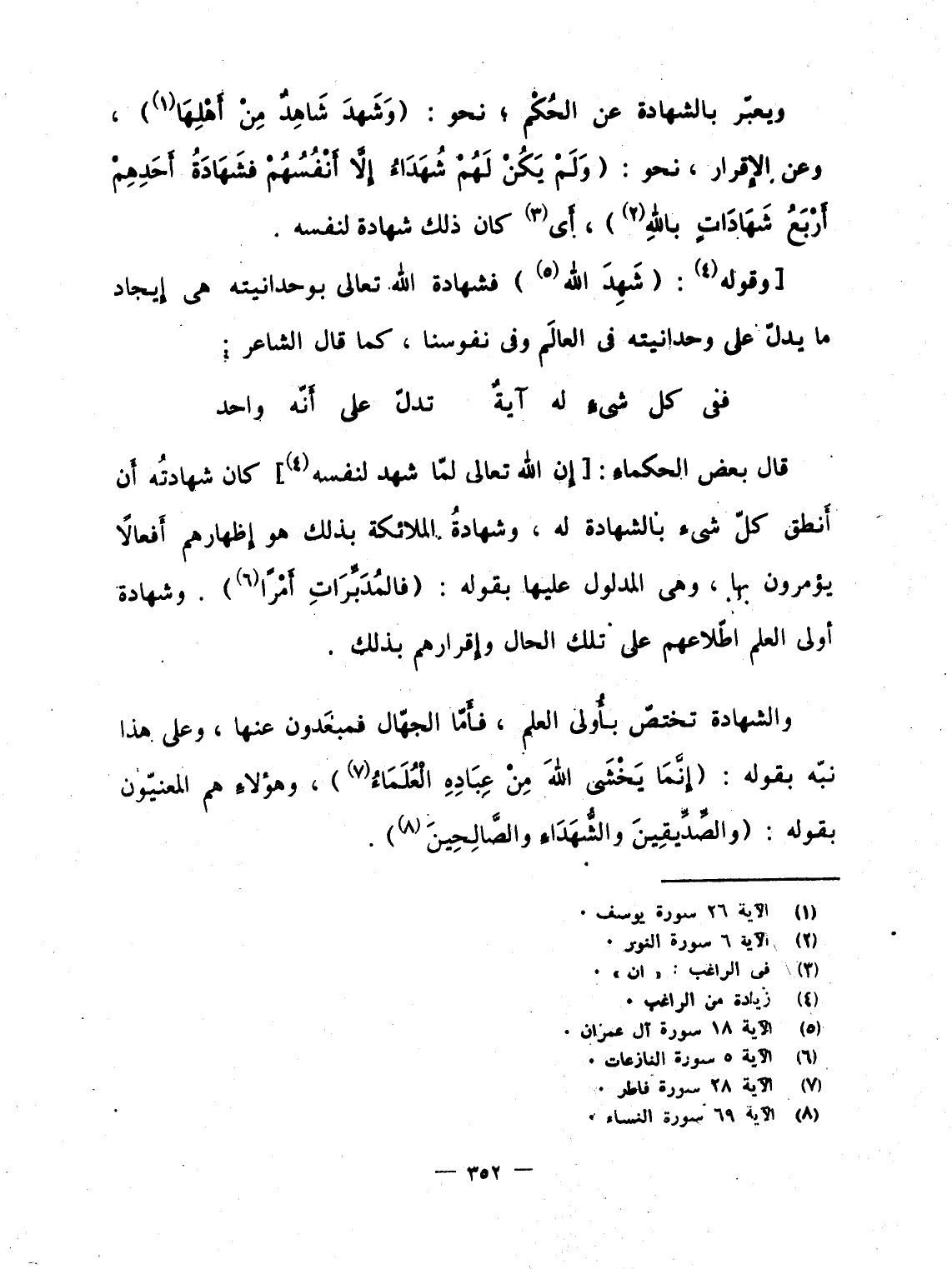 قال بعض الحكماءِ: [إِن الله تعالى لمّا شهد لنفسه] كان شهادتُه أَن أَنطق كلّ شىءِ بالشهادة له، وشهادةُ الملائكة بذلك هو إِظهارهم أَفعالاً يؤمرون بها، وهى المدلول عليها بقوله: {فالمدبرات أَمْراً} . وشهادة أولى العلم اطّلاعهم على تلك الحال وإِقرارهم بذلك.