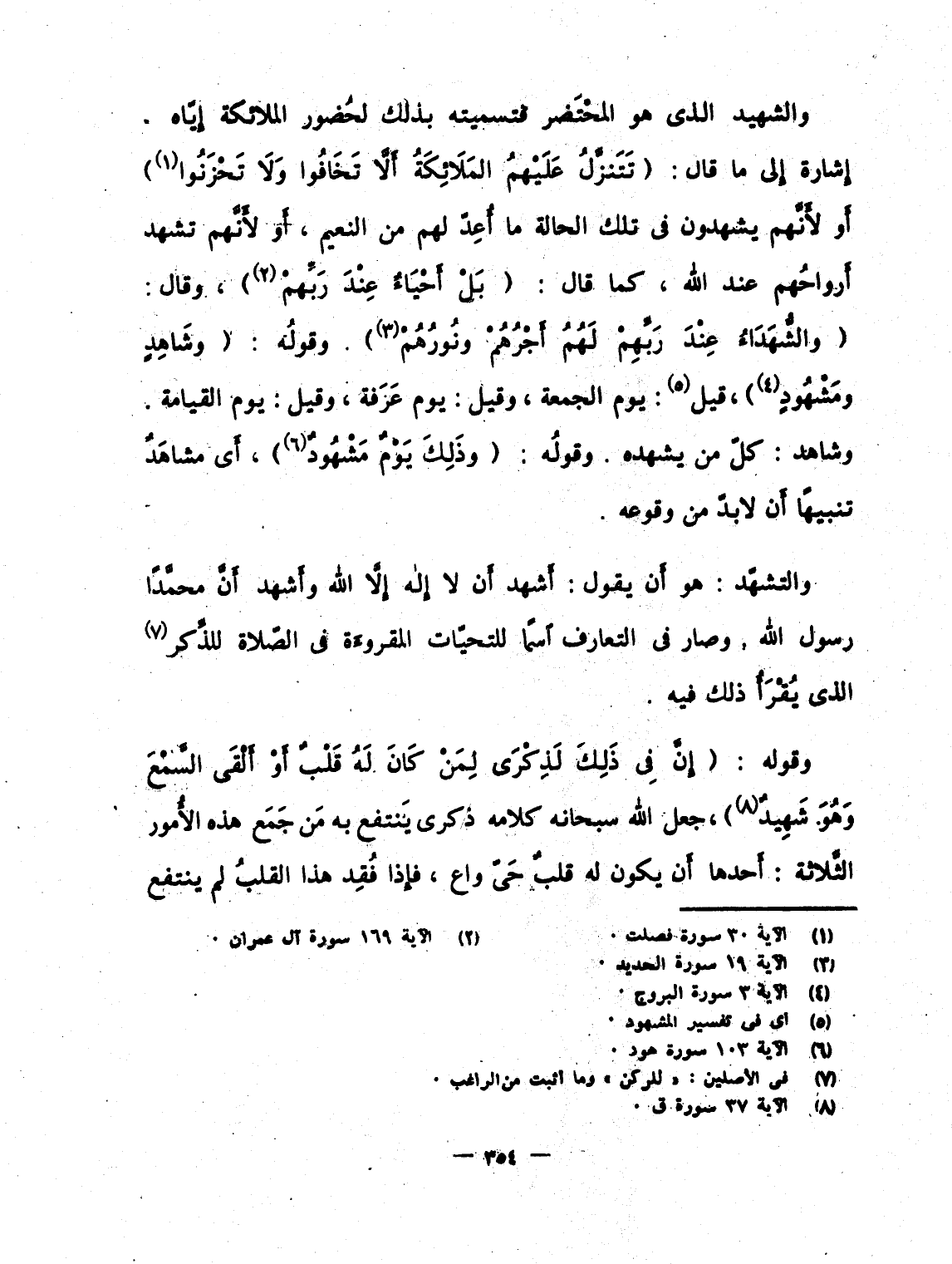 والشهيد الذى هو المحْتَضر فتسميته بذلك لحُضور الملائكة إِيّاه. إِشارة إِلى ما قال: {تَتَنَزَّلُ عَلَيْهِمُ الملائكة أَلاَّ تَخَافُواْ وَلاَ تَحْزَنُواْ} أَو لأَنَّهم يشهدون فى تلك الحالة ما أُعِدّ لهم من النعيم، أَو لأَنَّهم تشهد أَرواحُهم عند الله، كما قال: {بَلْ أَحْيَاءٌ عِندَ رَبِّهِمْ يُرْزَقُونَ} ، وقال: {والشهدآء عِندَ رَبِّهِمْ لَهُمْ أَجْرُهُمْ وَنُورُهُمْ} . وقولُه: {وَشَاهِدٍ وَمَشْهُودٍ} ، قيل: يوم الجمعة، وقيل: يوم عَرَفة، وقيل: يوم القيامة. وشاهد: كلّ من يشهده. وقولُه: {وَذَلِكَ يَوْمٌ مَّشْهُودٌ} . أَى مشاهَدٌ تنبيهًا أَن لابدّ من وقوعه.