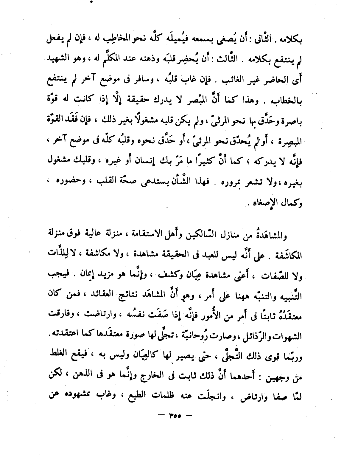 بكلامه. الثَّانى: أَن يُصغى بسمعه فيُميلَه كلَّه نحو المخاطِب له، فإِن لم يفعل لم ينتفع بكلامه. الثَّالث: أَن يُحضِر قلبَه وذهنه عند المكَّلم له، وهو الشهيد أَى الحاضر غير الغائب. فإِن غاب قلبُه. وسافر فى موضع آخر لم ينتفع بالخطاب. وهذا كما أَنَّ المبْصر لا يدرك حقيقة إِلاَّ إِذا كانت له قوّة باصرة وحَدَّق بها نحو المرئىّ، ولم يكن قلبه مشغولاً بغير ذلك، فإِن فَقَد القوّة المبصِرة، أَو لم يُحدّق نحو المرئىّ، أَو حَدَّق نحوه وقلبُه كلّه فى موضع آخر، فإِنَّه لا يدركه؛ كما أَنَّ كثيرًا ما مَرّ بك إِنسان أَو غيره، وقلبك مشغول بغيره، ولا تشعر بمروره. فهذا الشَّأن يستدعى صحّة القلب، وحضوره، وكمال الإِصغاءِ.