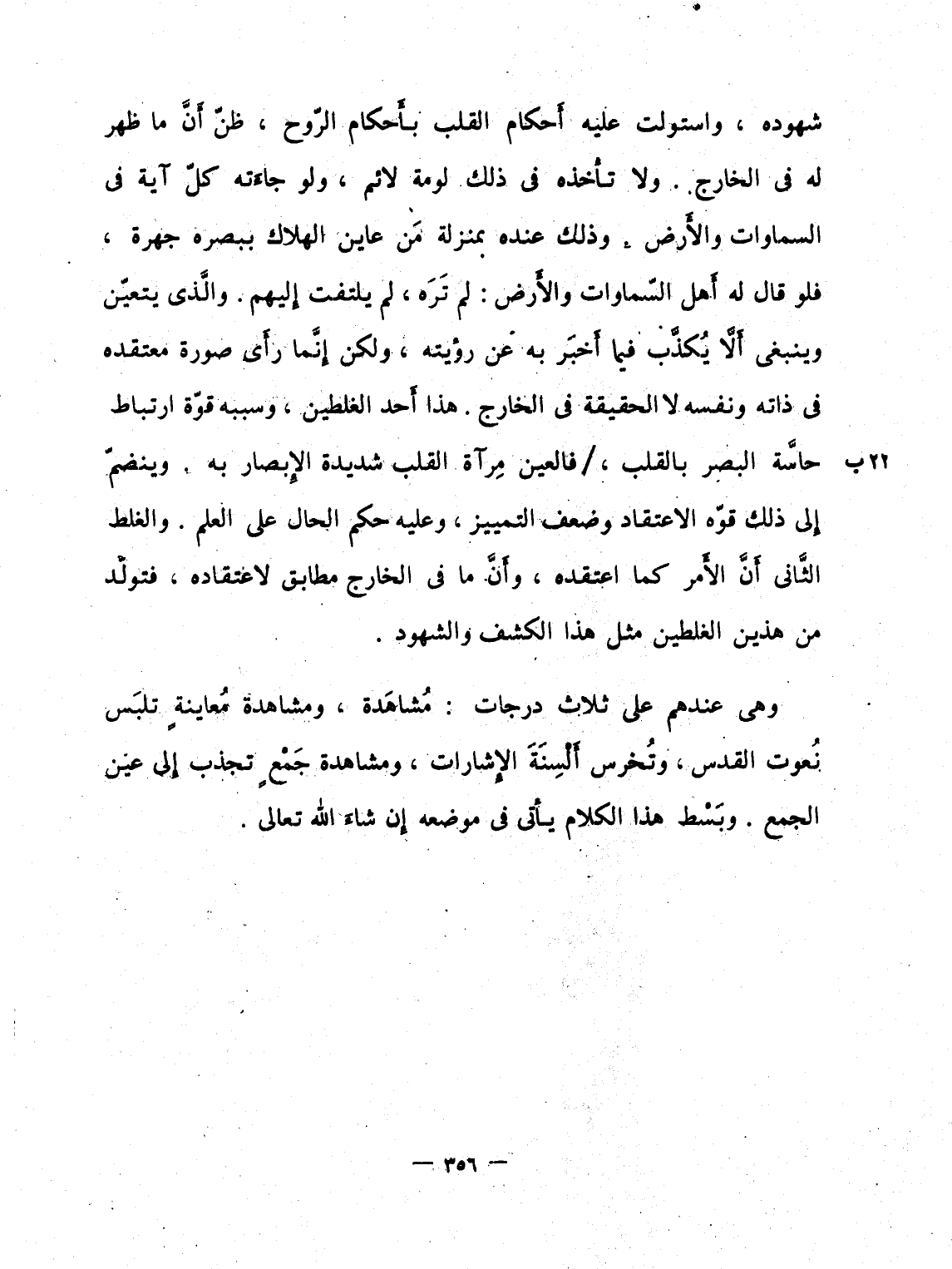 شهوده، واستولت عليه أَحكام القلب بأَحكام الرّوح، ظنّ أَنَّ ما ظهر له فى الخارج. ولا تأخذه فى ذلك لومة لائم، ولو جاءَته كلّ آية فى السماوات والأَرض، وذلك عنده بمنزلة مَن عاين الهلاك ببصره جهرة، فلو قال له أَهل السّماوات والأَرض: لم تَرَه، لم يلتفت إِليهم. والَّذى يتعيّن وينبغى أَلاَّ يُكذَّب فيما أَخبرَ به عن رؤيته، ولكن إِنَّما رأَى صورة معتقده فى ذاته ونفسه لا الحقيقة فى الخارج. هذا أَحد الغلطين، وسببه قوّة ارتباط حاسَّة البصر بالقلب، / فالعين مِرآة القلب شديدة الإِبصار به. وينضمّ إِلى ذلك قوّة الاعتقاد وضعف التمييز، وعليه حكم الحال على العلم. والغلط الثَّانى أنَّ الأَمر كما اعتقده، وأَنَّ ما فى الخارج مطابق لاعتقاده، فتولّد من هذين الغلطين مثل هذا الكشف والشهود.