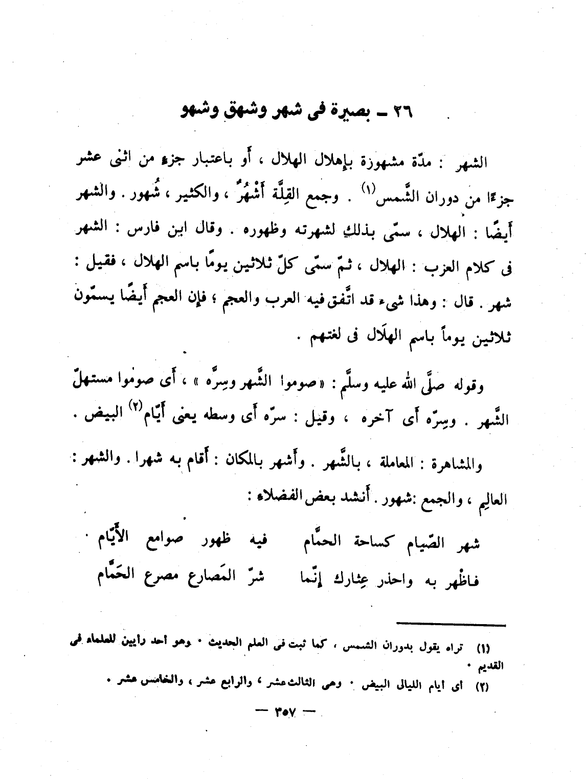 الشهر: مدّة مشهورة بإِهلال الهلال، أَو باعتبار جزءٍ من اثنى عشر جزءًا من دوران الشَّمس. وجمع القِلَّة أَشْهُرٌ، والكثير، شُهور. والشهر أَيضًا: الهلال، سمّى بذلك لشهرته وظهوره. وقال ابن فارس: الشهر فى كلام العرب: الهلال، ثمّ سمّى كلّ ثلاثين يومًا باسم الهلال، فقيل: شهر. قال: وهذا شىء قد اتَّفق فيه العرب والعجم؛ فإِن العجم أَيضًا يسمّون ثلاثين يومًا باسم الهلاَل فى لغتهم.