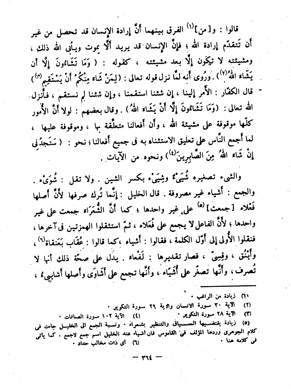 قالوا: و [من] الفرق بينهما أَنَّ إِرادة الإِنسان قد تحصل من غير أَن تَتقدّم إِرادة الله؛ فإِنَّ الإِنسان قد يريد أَلاَّ يموت ويأبى الله ذلك، ومشيئته لا تكون إِلاَّ بعد مشيئته، كقوله: {وَمَا تَشَآءُونَ إِلاَّ أَن يَشَآءَ الله} . وروُى أَنه لمَّا نزل قوله تعالى: {لِمَن شَآءَ مِنكُمْ أَن يَسْتَقِيمَ} قال الكفّار: الاَمر إِلينا، إِن شئنا استقمنا، وإِن شئنا لم نستقم، فأَنزل الله تعالى: {وَمَا تَشَآءُونَ إِلاَّ أَن يَشَآءَ الله} . وقال بعضهم: لولا أَنَّ الأُمور كلّها موقوفة على مشيئة الله، وأَن أَفعالنا متعلِّقة بها، وموقوفة عليها، لما أَجمع النَّاس على تعليق الاستثناءِ به فى جميع أَفعالنا؛ نحو: {ستجدني إِن شَآءَ الله مِنَ الصابرين} ونحوه من الآيات.
