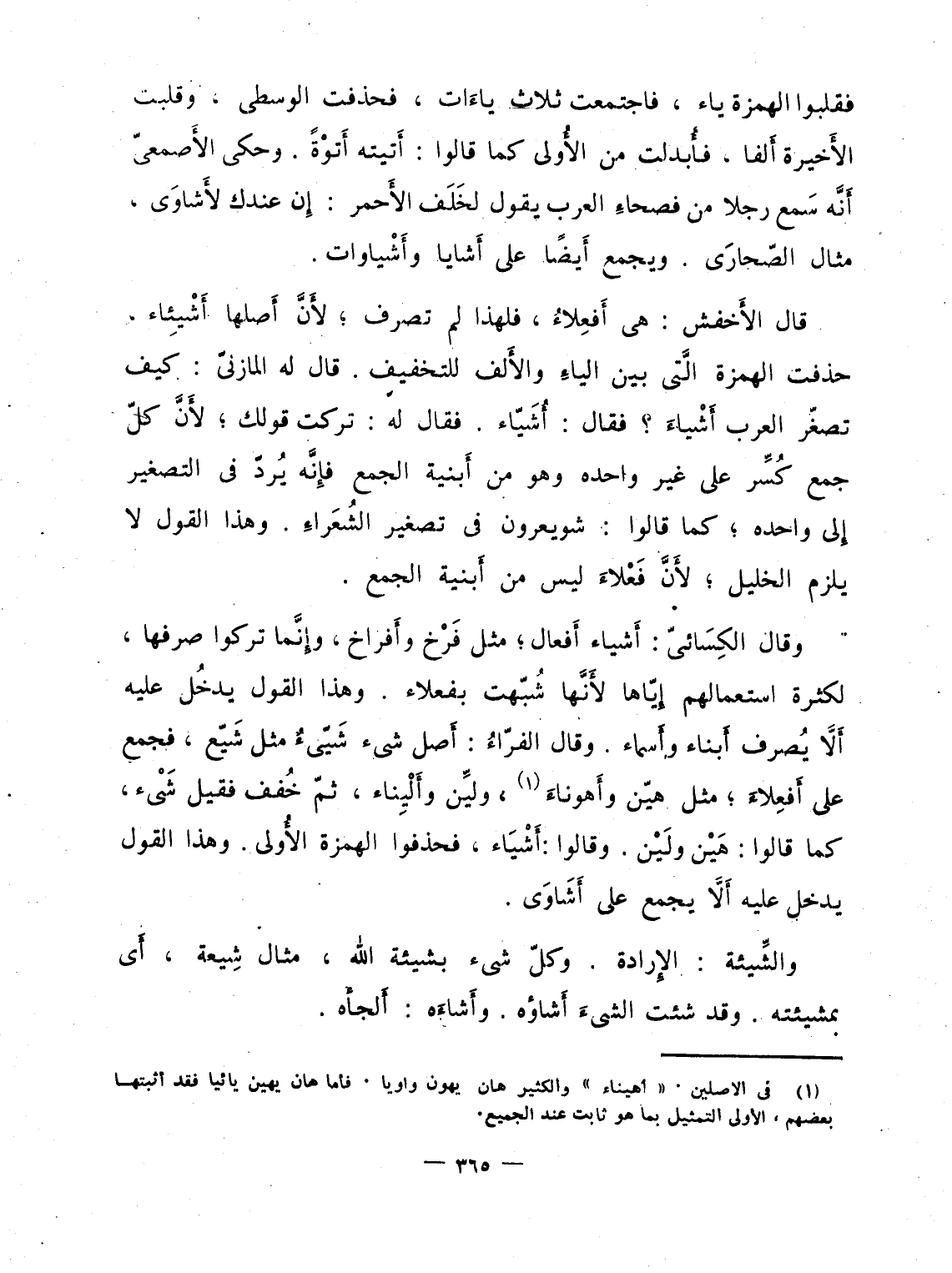 قال الأَخفش: هى أَفعِلاءُ، فلهذا لم تصرف؛ لأَنَّ أَصلها أَشْيِئاء، حذف الهمزة الَّتى بين الياءِ والأَلف للتخفيف. قال له المازنىّ: كيف تصغّر العرب أَشْياءَ؟ فقال: أُشَيّاء. فقال له: تركت قولك؛ لأَنَّ كلّ جمع كُسِّر على غير واحده وهو من أَبنية الجمع فإِنَّه يُردّ فى التصغير إِلى واحده؛ كما قالوا: شويعرون فى تصغير الشُعَراءِ. وهذا القول لا يلزم الخليل؛ لأَنَّ فَعْلاءَ ليس من أَبنية الجمع.