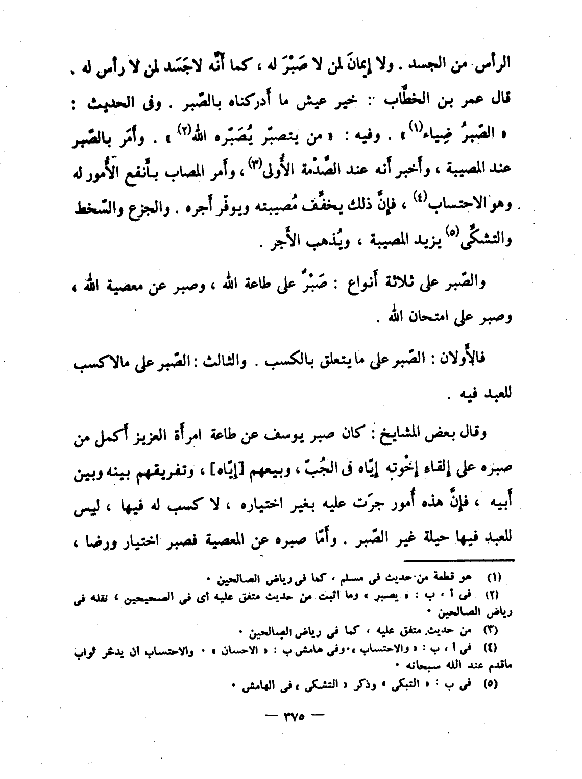 والصّبر على ثلاثة أَنواع: صَبْرٌ على طاعة الله، وصبر عن معصية الله، وصبر على امتحان الله.