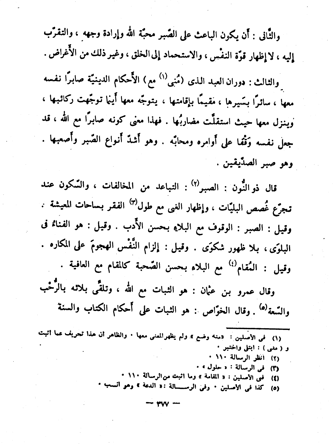 قال ذو النُّون: الصبر: التباعد من المخالفات، والسّكون عند تجرّع غُصص البليّات، وإِظهار الغنى مع طول الفقر بساحات المعيشة. وقيل: الصبر: الوقوف مع البلاءِ بحسن الأَدب. وقيل: هو الفناءُ فى البلوَى، بلا ظهور شكوَى. وقيل: إِلزام النَّفْس الهجومَ على المكاره. وقيل: المُقام مع البلاءِ بحسن الصّحبة كالمقام مع العافية.