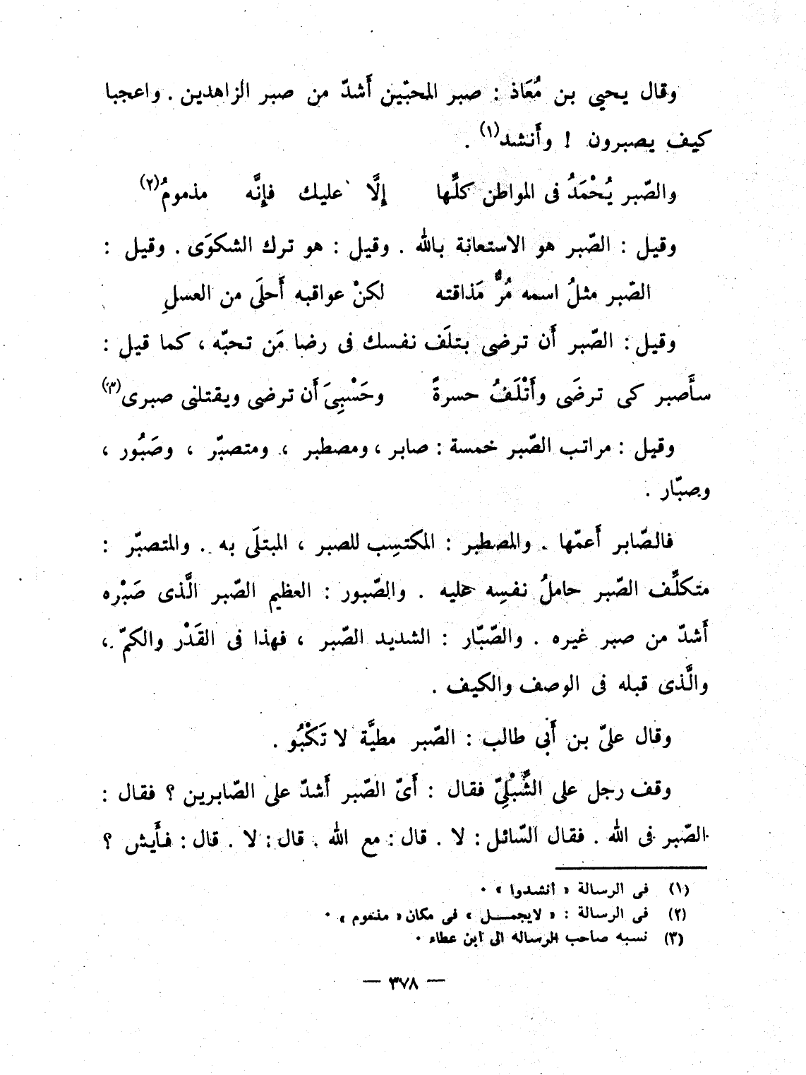 وقف رجل على الشِّبْلِىّ فقال: أَىّ الصّبر أَشدّ على الصّابرين؟ فقال: الصّبر فى الله. فقال السّائل: لا. قال: مع الله. قال: لا. قال: فأَيش؟