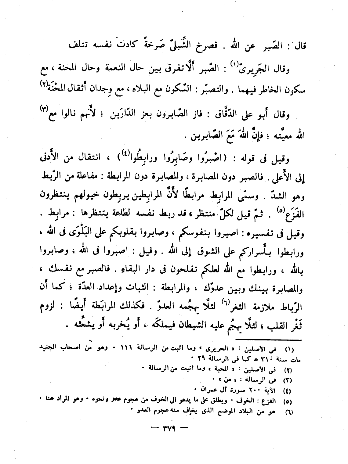 وقيل فى قوله: {اصبروا وَصَابِرُواْ وَرَابِطُواْ} ، انتقال من الأَدنى إِلى الأَعلى. فالصبر دون المصابرة، والمصابرة دون المرابطة: مفاعلة من الرّبط وهو الشدّ. وسمّى المرابِط مرابطًا لأَنَّ المرابِطين يربِطون خيولهم ينتظرون الفَزَع. ثمّ قيل لكلّ منتظر، قد ربط نفسه لطاعة ينتظرها: مرابِط. وقيل فى تفسيره: اصبروا بنفوسكم، وصابروا بقلوبكم على البَلْوَى فى الله، ورابطوا بأَسراركم على الشوق إِلى الله. وقيل: اصبروا فى الله، وصابروا بالله، ورابطوا مع الله لعلكم تفلحون فى دار البقاءِ. فالصبر مع نفسك، والمصابرة بينك وبين عدوّك، والمرابطة: الثبات وإِعداد العدّة؛ كما أَن الرّباط ملازمة الثغر لئلاً يهجُمه العدوّ. فكذلك المرابَطة أَيضًا: لزوم ثَغْر القلب؛ لئلاَّ يهجُم عليه الشيطان فيملكَه. أَو يُخربه أَو يشعِّثه.