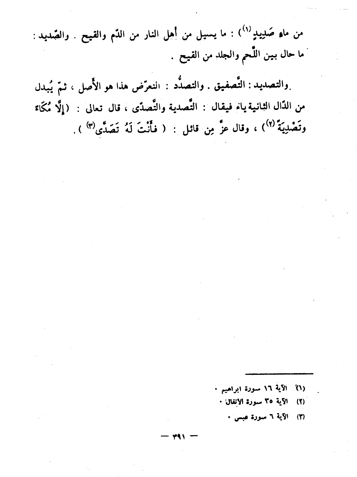 والتصديد: التَّصفيق. والتصدُّد: التعرّض هذا هو الأَصل، ثمّ يُبدل من الدّال الثانية ياء فيقال: التَّصدية والتَّصدّى، قال تعالى: {إِلاَّ مُكَآءً وَتَصْدِيَةً} ، وقال عزَّ مِن قائل: {فَأَنتَ لَهُ تصدى} .