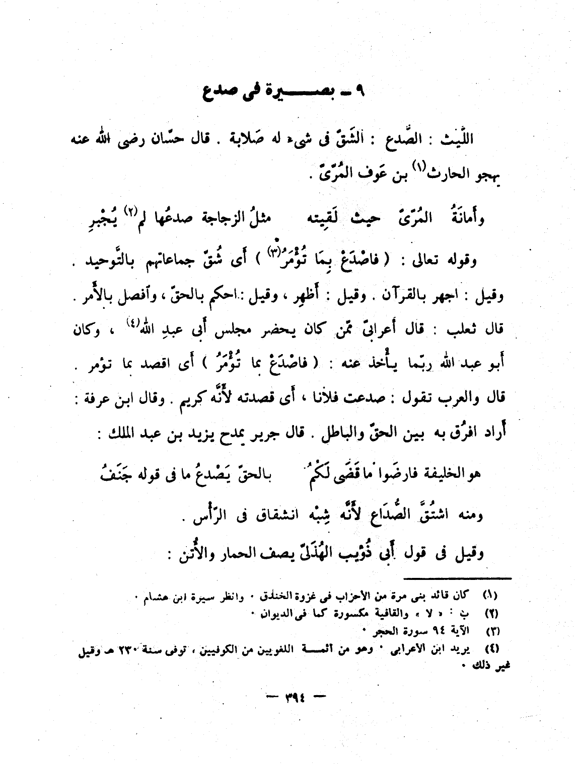 اللَّيث: الصَّدع: الشَقّ فى شىء له صَلابة. قال حسّان رضى الله عنه يهجو الحارث بن عَوف المُرّىّ.