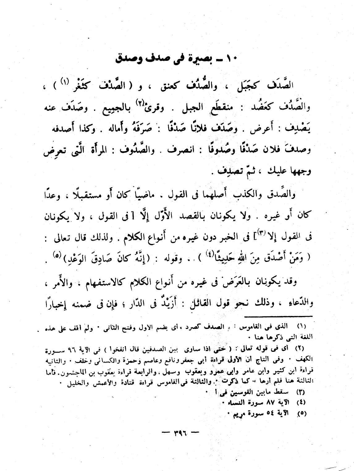 والصَّديق والكذب أَصلها فى القول، ماضيًا كان أَو مستقبلاً، وعدًا كان أَو غيره. ولا يكونان بالقصد الأَوّل إِلاَّ [فى القول، ولا يكونان فى القول إِلا] فى الخبر دون غيره من أَنواع الكلام. ولذلك قال تعالى: {وَمَنْ أَصْدَقُ مِنَ الله حَدِيثاً} ، وقوله: {إِنَّهُ كَانَ صَادِقَ الوعد} .