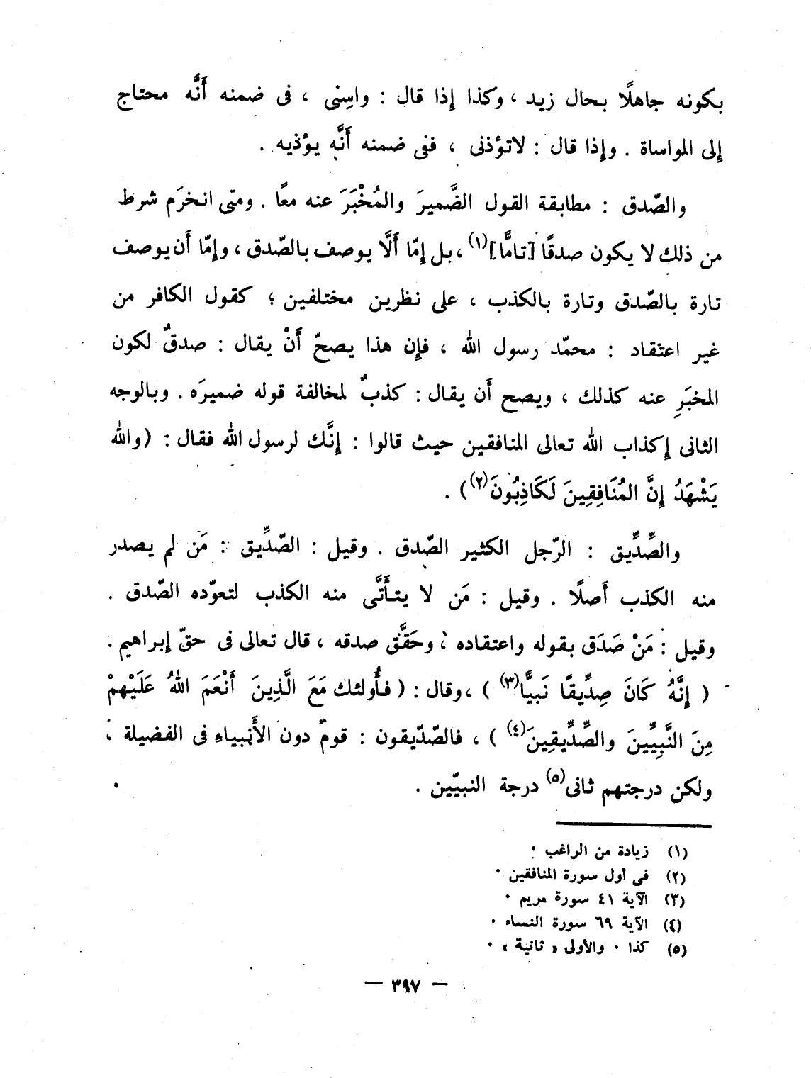 والصّدق: مطابقة القول الضَّميرَ والمُخْبَرَ عنه معًا. ومتى انخَرم شرط من ذلك لا يكون صدقًا [تامًّا] ، بل إِمّا أَلاَّ يوصف بالصّدق، وإِمّا أَن يوصف تارة بالصّدق وتارة بالكذب، على نظرين مختلفين؛ كقول الكافر من غير اعتقاد: محمّد رسول الله، فإِن هذا يصحّ أَنْ يقال: صدقٌ لكون المخبَرِ عنه كذلك، ويصح أَن يقال: كذبٌ لمخالفة قوله ضميرَه. وبالوجه الثانى إِكذاب الله تعالى المنافقين حيث قالوا: إِنَّك لرسول الله فقال: {والله يَشْهَدُ إِنَّ المنافقين لَكَاذِبُونَ} .