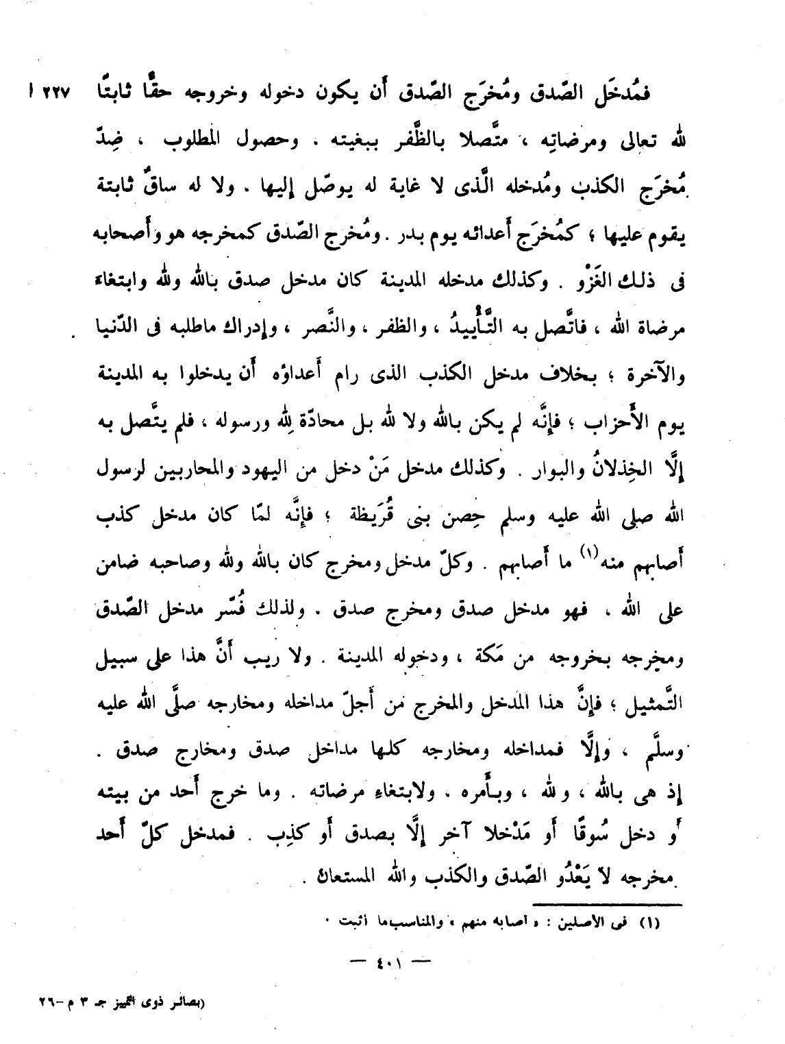 فمُدخَل الصّدق ومُخرَج الصّدق أَن يكون دخوله وخروجه حقًّا ثابتًا لله تعالى ومرضاتِه. متَّصلا بالظَّفر ببغيته، وحصول المطلوب، ضِدّ مُخرَج الكذب ومُدخله الَّذى لا غاية له يوصّل إِليها، ولا له ساقٌ ثابتة يقوم عليها؛ كمُخرَج أَعدائه يوم بدر. ومُخرج الصّدق كمخرجه هو وأَصحابه فى ذلك الغَزْو. وكذلك مدخله المدينة كان مدخل صدق بالله والله وابتغاءَ مرضاة الله، فاتَّصل به التَّأْييدُ، والظفر، والنَّصر. وإِدراك ما طلبه فى الدّنيا والآخرة؛ بخلاف مدخل الكذب الذى رام أَعداؤه أَن يدخلوا به المدينة يوم الأَحزاب؛ فإِنَّه لم يكن بالله ولا لله بل محادّة لله وسوله، فلم يتَّصل به إِلاَّ الخِذلانُ والبوار، وكذلك مدخل مَنْ دخل من اليهود والمحاربين لرسول الله صلى الله عليه وسلم حِصن بنى قُرَيطة؛ فإِنَّه لمّا كان مدخل كذب أَصابهم منه ما أصابهم. وكلّ مدخل ومخرج كان بالله ولله وصاحبه ضامن على الله، فهو مدخل صدق ومخرج صدق، ولذلك فُسّر مدخل الصّدق ومخرجه بخروجه من مَكة، ودخوله المدينة. ولا ريب أَنَّ هذا على سبيل التَّمثيل؛ فإِنَّ هذا المدخل والمخرج من أَجلّ مداخله ومخارجه صلَّى الله عليه وسلَّم، وإِلاَّ فمداخله ومخارجه كلها مداخل صدق ومخارج صدق. إذ هى بالله، ولله، وبأَمره، ولابتغاءِ مرضاته. وما خرج أَحد من بيته أَو دخل سُوقًا أَو مَدْخلا آخر إِلاَّ بصدق أَو كذِب. فمدخل كلّ أَحد ومخرجه لا يَعْدُو الصّدق والكذب والله المستعان.