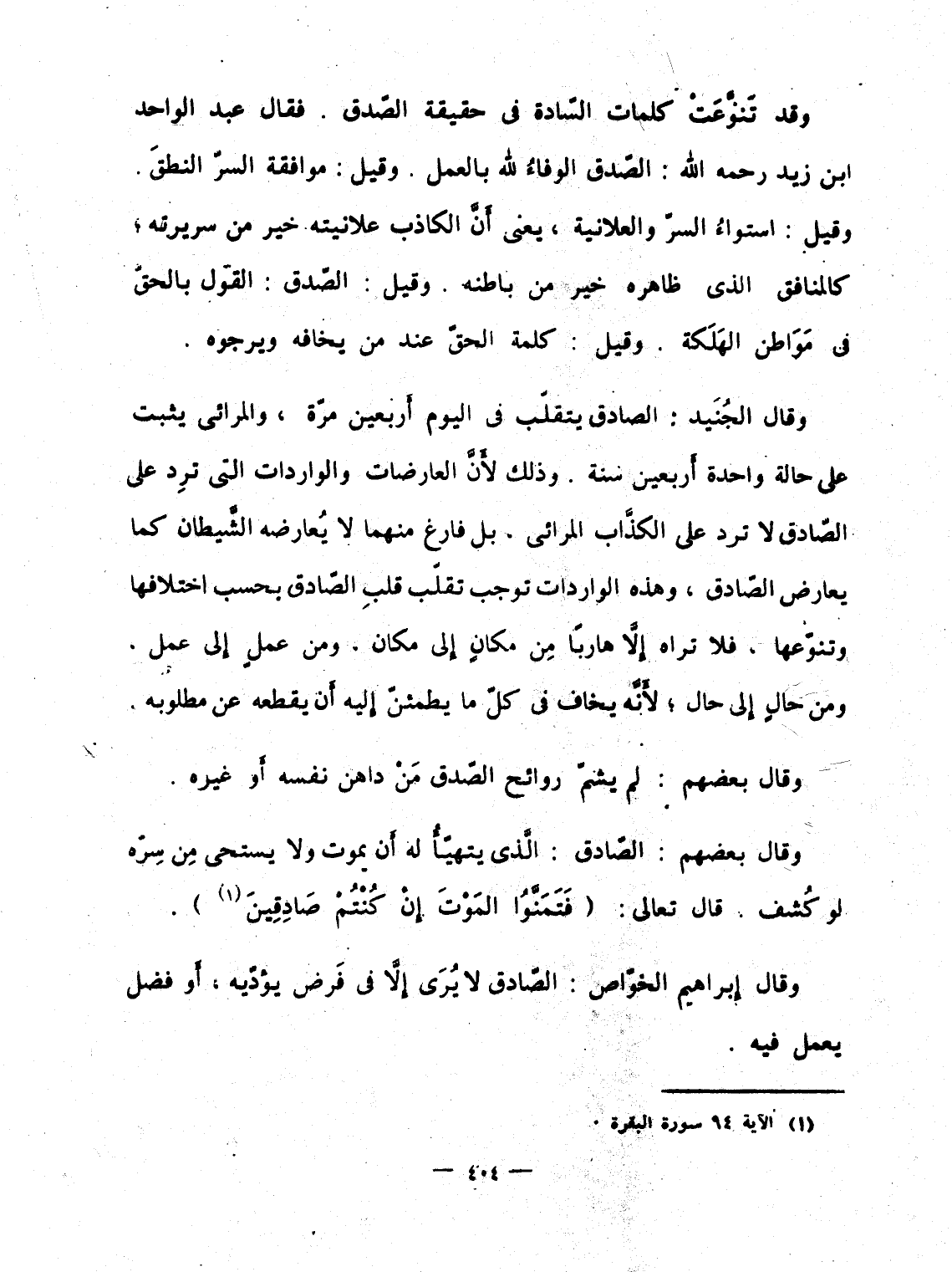 وقد تَنوَّعَتْ كلمات السّادة فى حقيقة الصّدق. فقال عبد الواحد ابن زيد رحمه الله: الصّدق الوفاءُ لله بالعمل. وقيل: موافقة السرّ النطقَ. وقيل: استواءُ السرّ والعلانية، يعنى أَنَّ الكاذب علانيته خير من سريرته؛ كالمنافق الذى ظاهره خير من باطنه. وقيل: الصّدق: القول بالحقّ فى مَوَاطن الهَلَكة. وقيل: كلمة الحقّ عند من يخافه ويرجوه.
