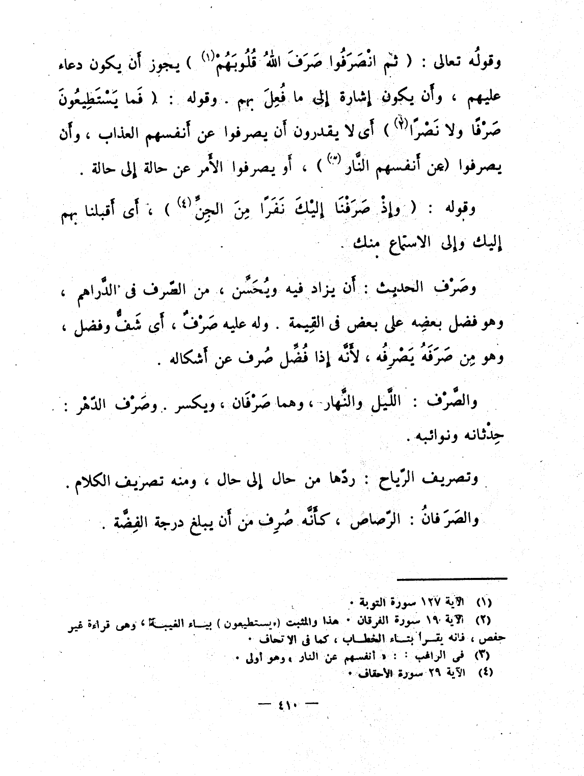 وقولُه تعالى: {ثُمَّ انصرفوا صَرَفَ الله قُلُوبَهُم} يجوز أَن يكون دعاء عليهم، وأَن يكون إِشارة إِلى ما فُعِلَ بهم. وقوله: {فَمَا يَسْتَطِيعُونَ صَرْفاً وَلاَ نَصْراً} أَى لا يقدرون أَن يصرفوا عن أَنفسهم العذاب، وأَن يصرفوا (عن أَنفسهم النَّار) ، أَو يصرفوا الأَمر عن حالة إِلى حالة.