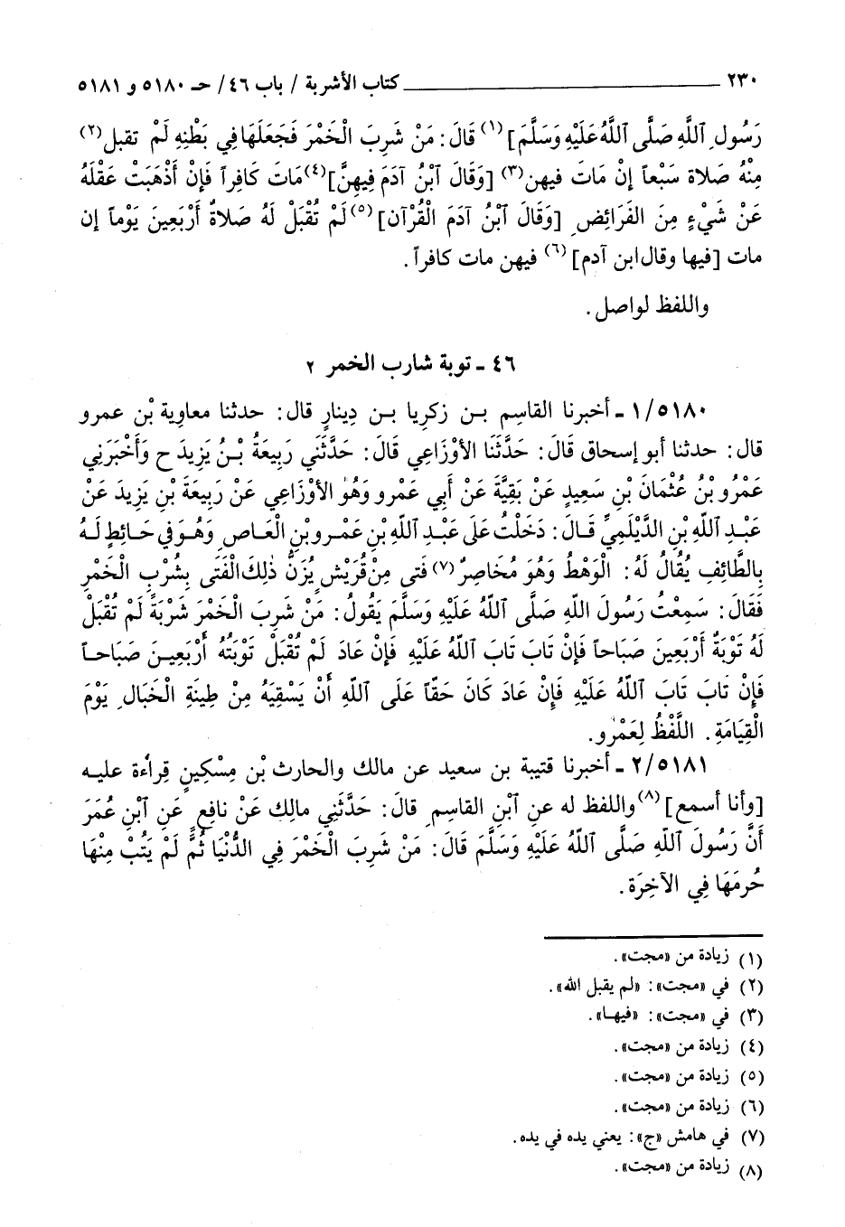5180 - أخبرنا القاسم بن زكريا بن دينار قال حدثنا معاوية بن عمرو قال حدثنا أبو إسحاق قال حدثنا الأوزاعي قال حدثني ربيعة بن يزيد ح وأخبرني عمرو بن عثمان بن سعيد عن بقية عن أبي عمرو وهو الأوزاعي عن ربيعة بن يزيد عن عبد الله بن الديلمي قال : دخلت على عبد الله بن عمرو بن العاص وهو في حائط له بالطائف يقال له الوهط وهو مخاصر فتى من قريش يزن ذلك الفتى بشرب الخمر فقال سمعت رسول الله صلى الله عليه و سلم يقول من شرب الخمر شربة لم تقبل له توبة أربعين صباحا فإن تاب تاب الله عليه فإن عاد لم تقبل توبته أربعين صباحا فإن تاب تاب الله عليه فإن عاد كان حقا على الله أن يسقيه من طينة الخبال يوم القيامة اللفظ لعمرو