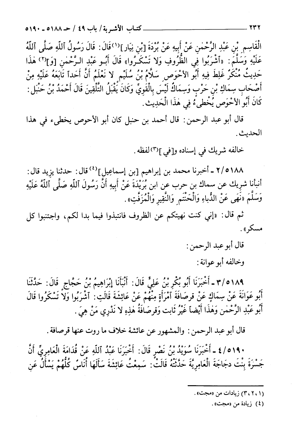 5189 - أخبرنا أبو بكر بن علي قال أنبأنا إبراهيم بن حجاج قال حدثنا أبو عوانة عن سماك عن قرصافة امرأة منهم عن عائشة قالت : اشربوا ولا تسكروا قال أبو عبد الرحمن وهذا أيضا غير ثابت وقرصافة هذه لا ندري من هي قال أبو عبد الرحمن والمشهور عن عائشة خلاف ما روت عنها قرصافة