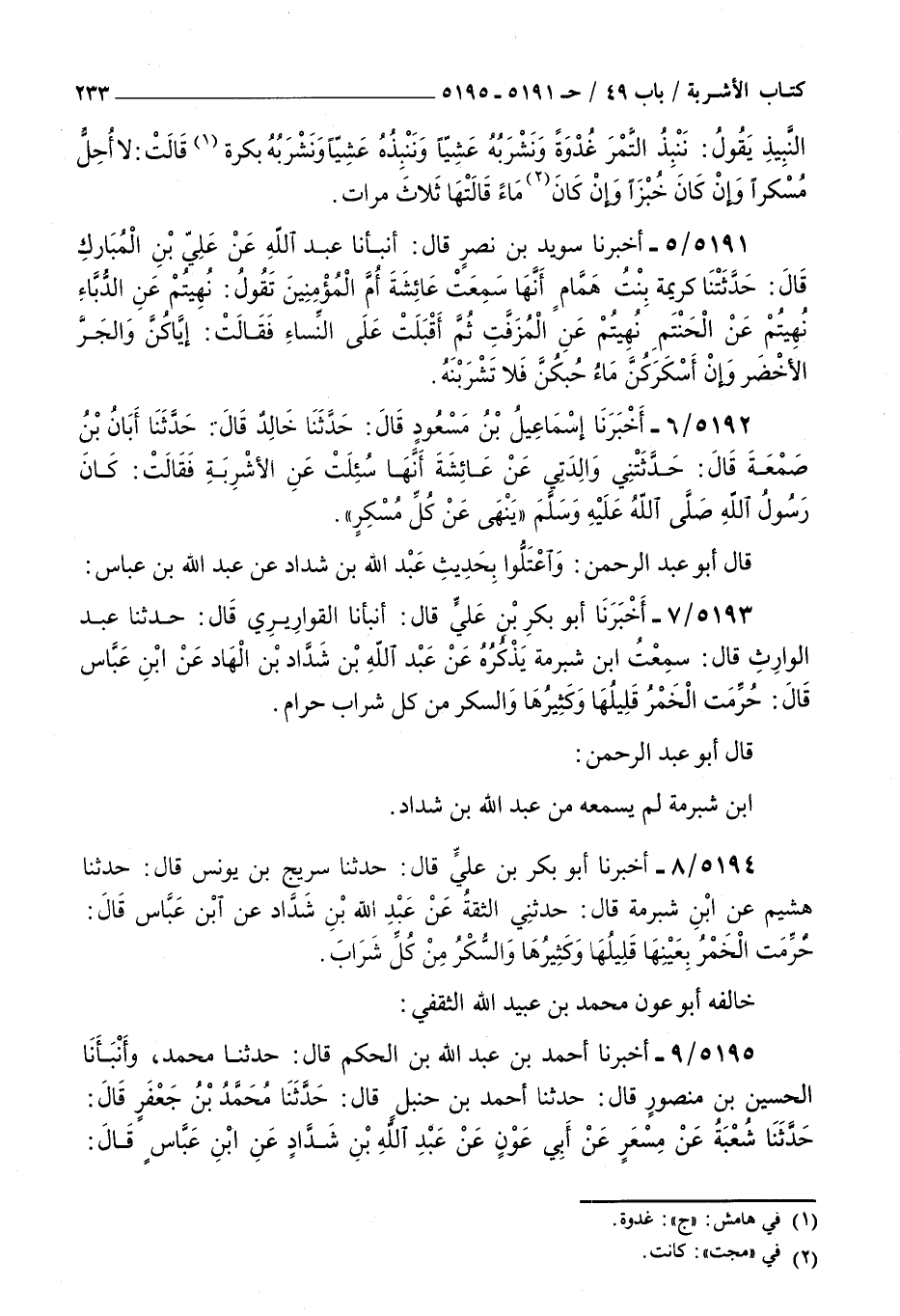 5195 - أخبرنا أحمد بن عبد الله بن الحكم قال حدثنا محمد وأنبأنا الحسين بن منصور قال حدثنا أحمد بن حنبل قال حدثنا محمد بن جعفر قال حدثنا شعبة عن مسعر عن أبي عون عن عبد الله بن شداد عن بن عباس قال : حرمت الخمر بعينها قليلها وكثيرها والسكر من كل شراب لم يذكر بن الحكم قليلها وكثيرها