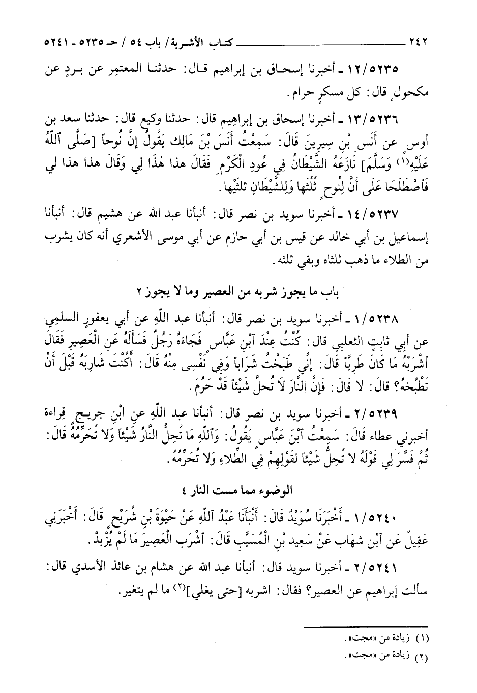 5240 - أخبرنا سويد قال أنبأنا عبد الله عن حيوة بن شريح قال أخبرني عقيل عن بن شهاب عن سعيد بن المسيب قال : اشرب العصير ما لم يزبد