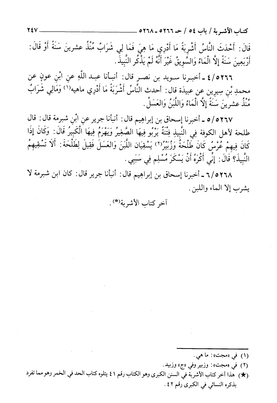 5268 - أخبرنا إسحاق بن إبراهيم قال أنبأنا جرير قال : كان بن شبرمة لا يشرب إلا الماء واللبن [ ص 248 ] بسم الله الرحمن الرحيم وصلى الله على سيدنا محمد وآله وصحبه وسلم تسليما