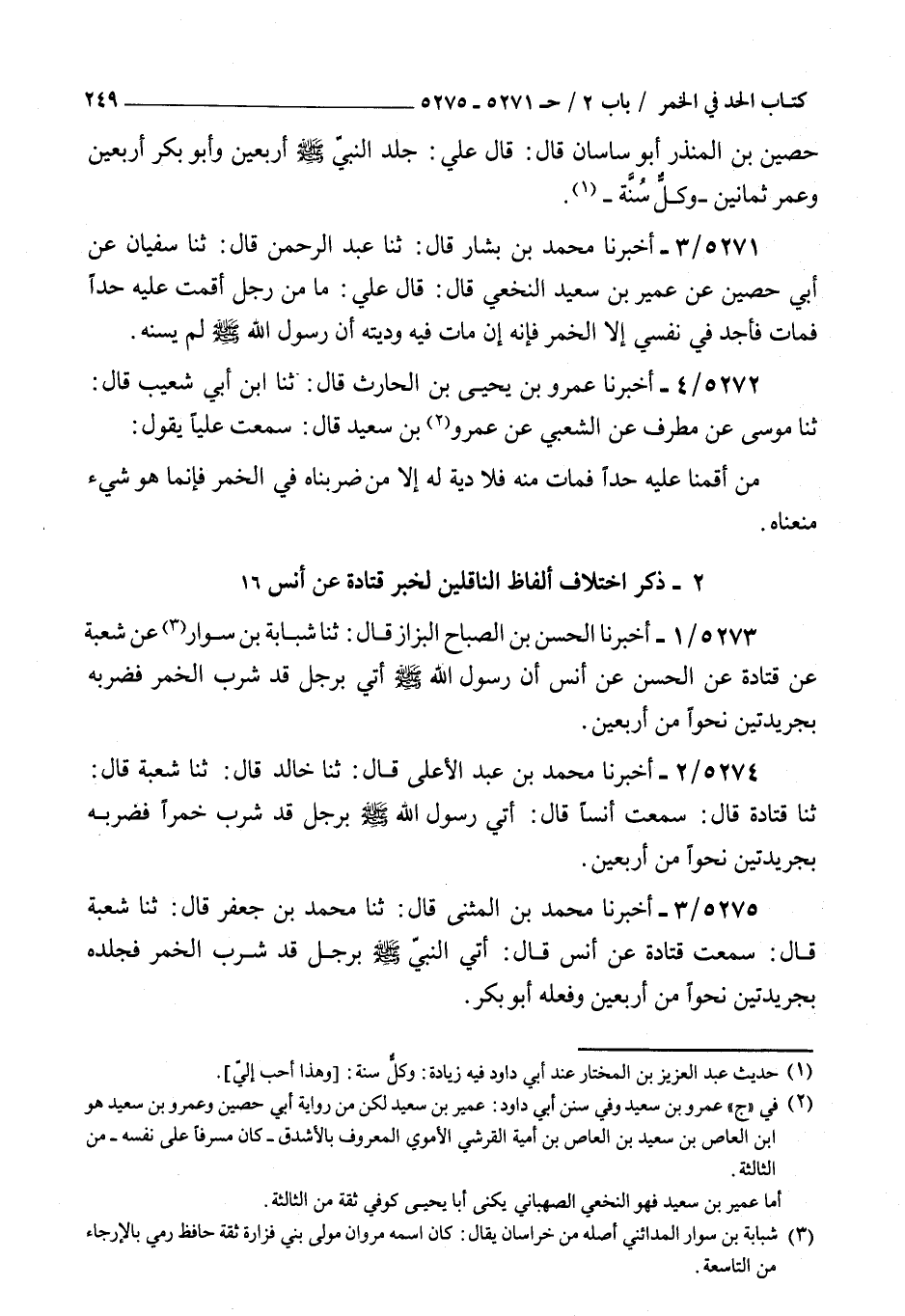 5274 - أخبرنا محمد بن عبد الأعلى قال ثنا خالد قال ثنا شعبة قال ثنا قتادة قال سمعت أنسا قال : أتي رسول الله صلى الله عليه و سلم برجل قد شرب خمرا فضربه بجريدتين نحوا من أربعين