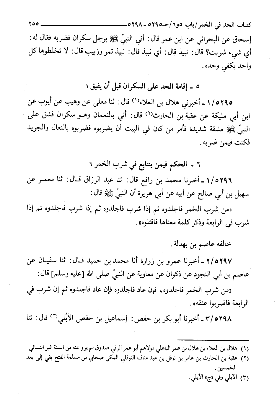 5295 - أخبرني هلال بن العلاء قال ثنا معلى عن وهيب عن أيوب عن بن أبي مليكة عن عقبة بن الحارث قال : أتي بالنعمان وهو سكران فشق على النبي صلى الله عليه و سلم مشقة شديدة فأمر من كان في البيت أن يضربوه فضربوه بالنعال والجريد فكنت فيمن ضربه