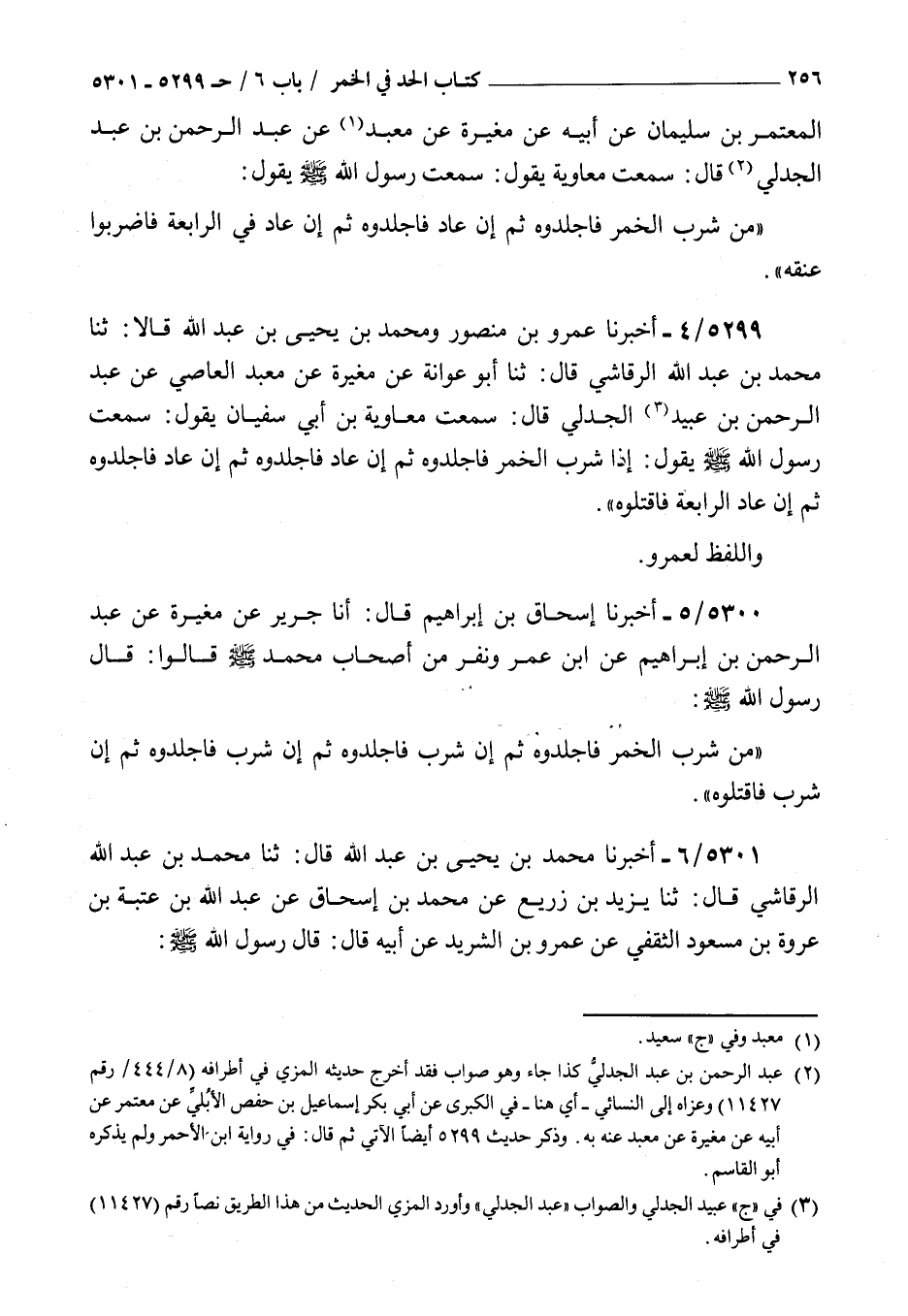 5299 - أخبرنا عمرو بن منصور ومحمد بن يحيى بن عبد الله قالا ثنا محمد بن عبد الله الرقاشي قال ثنا أبو عوانة عن مغيرة عن معبد العاصي عن عبد الرحمن بن عبيد الجدلي قال سمعت معاوية بن أبي سفيان يقول سمعت رسول الله صلى الله عليه و سلم يقول : إذا شرب الخمر فاجلدوه ثم إن عاد فاجلدوه ثم إن عاد فاجلدوه ثم إن عاد الرابعة فاقتلوه واللفظ لعمرو