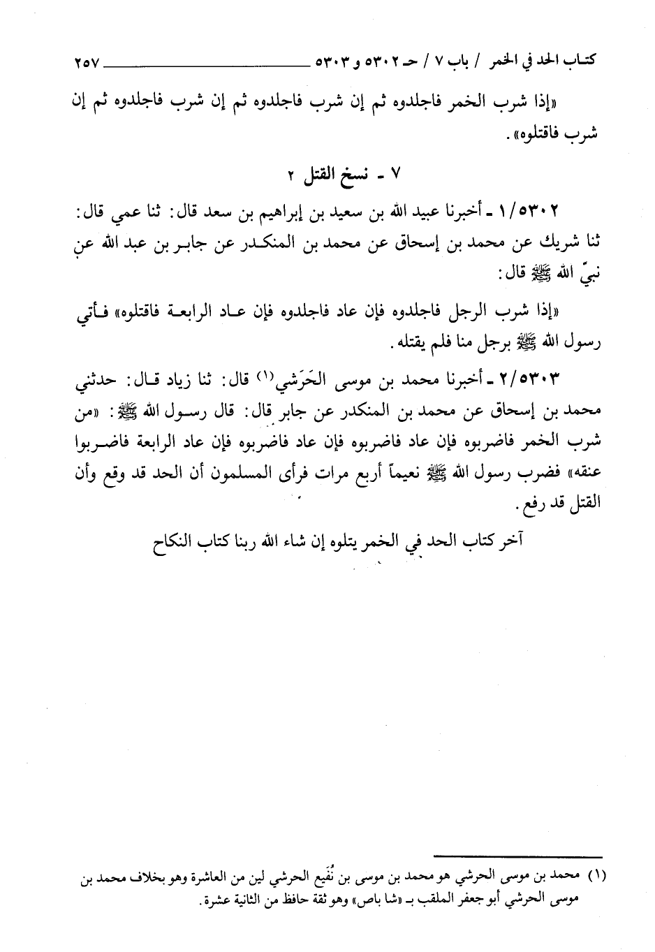 5303 - أخبرنا محمد بن موسى الحرشي قال ثنا زياد قال حدثني محمد بن إسحاق عن محمد بن المنكدر عن جابر قال قال رسول الله صلى الله عليه و سلم : من شرب الخمر فاضربوه فإن عاد فاضربوه فإن عاد فاضربوه فإن عاد الرابعة فاضربوا عنقه فضرب رسول الله صلى الله عليه و سلم نعيما أربع مرات فرأى المسلمون أن الحد قد وقع وأن القتل قد رفع [ ص 258 ] الحمد لله رب العالمين بسم الله الرحمن الرحيم وصلى الله على سيدنا محمد وآله وصحبه وسلم تسليما