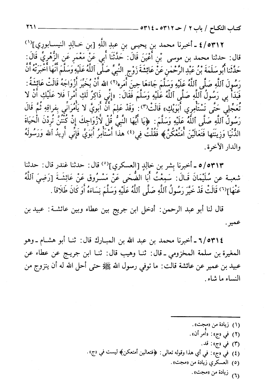 5313 - أخبرنا بشر بن خالد العسكري قال حدثنا غندر قال حدثنا شعبة عن سليمان قال سمعت أبا الضحى عن مسروق عن عائشة رضي الله عنها قالت : قد خير رسول الله صلى الله عليه و سلم نساءه أو كان طلاقا قال لنا أبو عبد الرحمن أدخل بن جريج بين عطاء وبين عائشة عبيد بن عمير