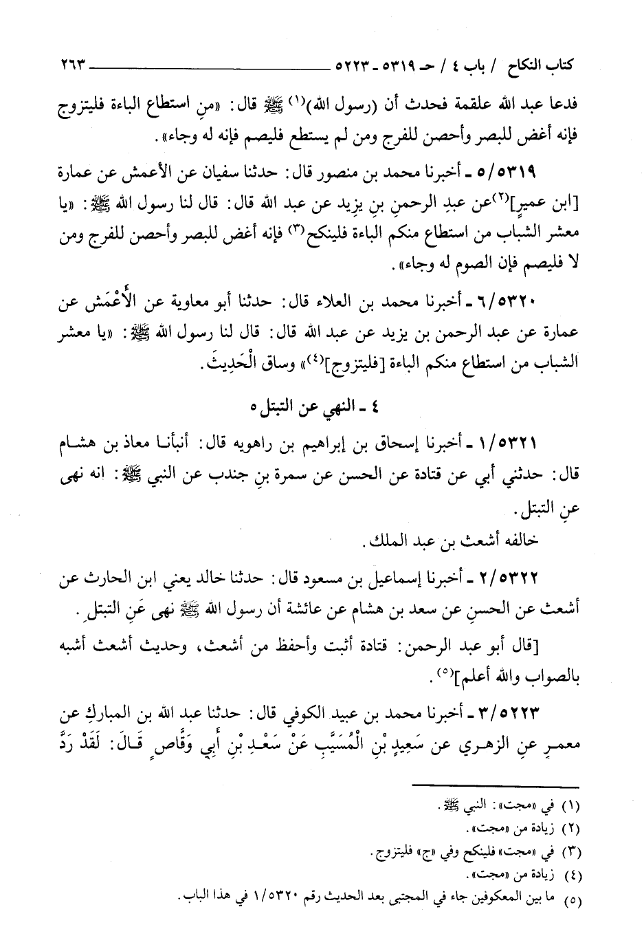 5320 - أخبرنا محمد بن العلاء قال حدثنا أبو معاوية عن الأعمش عن عمارة عن عبد الرحمن بن يزيد عن عبد الله قال قال لنا رسول الله صلى الله عليه و سلم : يا معشر الشباب من استطاع منكم الباءة فليتزوج وساق الحديث
