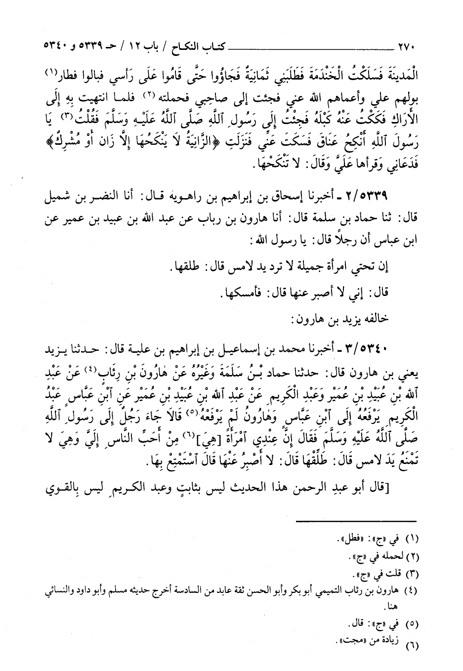 5339 - أخبرنا إسحاق بن إبراهيم بن راهويه قال أنا النضر بن شميل قال ثنا حماد بن سلمة قال أنا هارون بن رباب عن عبد الله بن عبيد بن عمير عن بن عباس أن رجلا قال : يا رسول الله إن تحتي امرأة جميلة لا ترد يد لامس قال طلقها قال إني لا أصبر عنها قال فأمسكها خالفه يزيد بن هارون