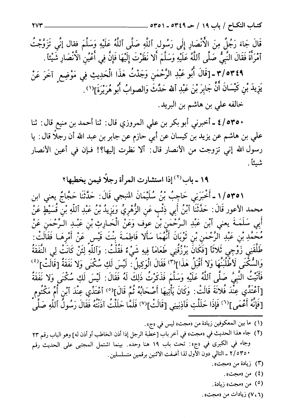 5350 - أخبرني أبو بكر بن علي المروزي قال ثنا أحمد بن منيع قال ثنا علي بن هاشم عن يزيد بن كيسان عن أبي حازم عن جابر بن عبد الله : أن رجلا قال يا رسول الله إني تزوجت من الأنصار قال ألا نظرت إليها فإن في أعين الأنصار شيئا