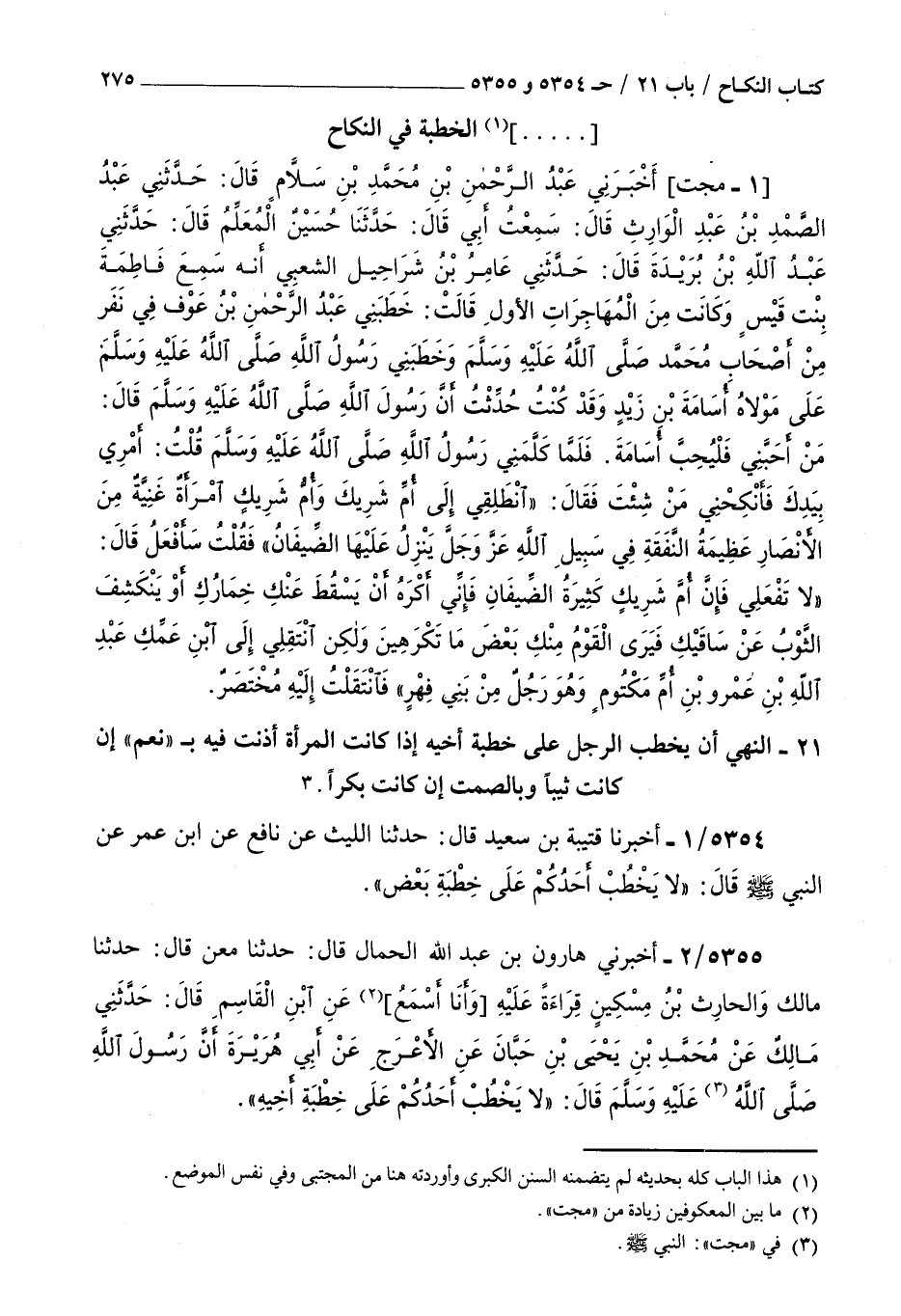 5354 - أخبرنا قتيبة بن سعيد قال حدثنا الليث عن نافع عن بن عمر عن النبي صلى الله عليه و سلم قال : لا يخطب أحدكم على خطبة بعض