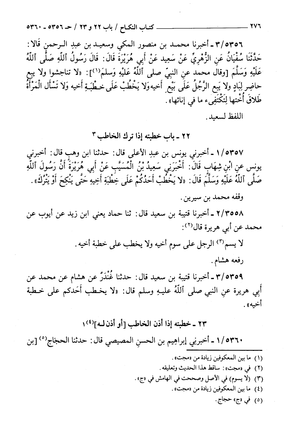 5359 - أخبرنا قتيبة بن سعيد قال حدثنا غندر عن هشام عن محمد عن أبي هريرة عن النبي صلى الله عليه و سلم قال : لا يخطب أحدكم على خطبة أخيه