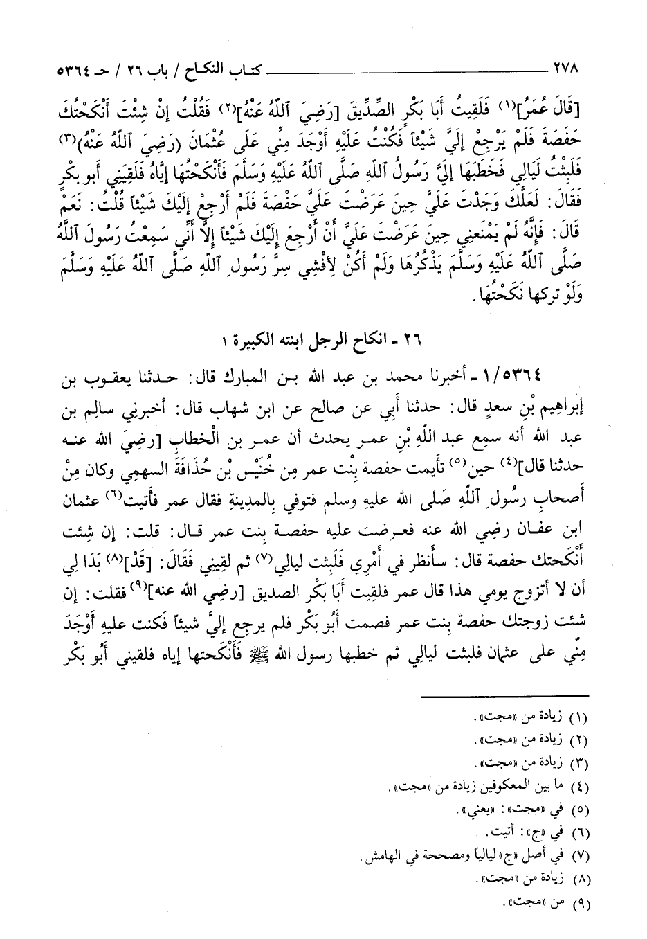 5364 - أخبرنا محمد بن عبد الله بن المبارك قال حدثنا يعقوب بن إبراهيم بن سعد قال حدثنا أبي عن صالح عن بن شهاب قال أخبرني سالم بن عبد الله أنه سمع عبد الله بن عمر يحدث أن عمر بن الخطاب رضي الله عنه حدثنا قال : حين تأيمت حفصة بنت عمر من خنيس بن حذافة السهمي وكان من أصحاب رسول الله صلى الله عليه و سلم فتوفي بالمدينة فقال عمر فأتيت عثمان بن عفان رضي الله عنه فعرضت عليه حفصة بنت عمر قال قلت إن شئت أنكحتك حفصة قال سأنظر في أمري فلبثت ليالي ثم لقيني فقال قد بدا لي أن لا أتزوج يومي هذا قال عمر فلقيت أبا بكر الصديق رضي الله عنه فقلت إن شئت زوجتك حفصة بنت عمر فصمت أبو بكر فلم يرجع إلي شيئا فكنت عليه أوجد مني على عثمان فلبثت ليالي ثم خطبها رسول الله صلى الله عليه و سلم فأنكحتها أياه فلقيني أبو بكر فقال لعلك وجدت على حين عرضت على حفصة فلم أرجع إليك شيئا قال عمر قلت نعم قال فإنه لم يمنعني أن أرجع إليك شيئا فيما عرضت علي إلا أني قد كنت علمت أن رسول الله صلى الله عليه و سلم قد ذكرها فلم أكن لأفشي سر رسول الله صلى الله عليه و سلم ولو تركها رسول الله صلى الله عليه و سلم قبلتها