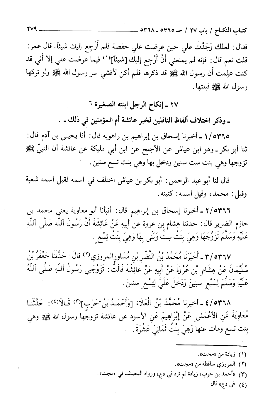 5368 - أخبرنا محمد بن العلاء وأحمد بن حرب قالا حدثنا معاوية عن الأعمش عن إبراهيم عن الأسود عن عائشة : تزوجها رسول الله صلى الله عليه و سلم وهي بنت تسع ومات عنها وهي بنت ثماني عشرة