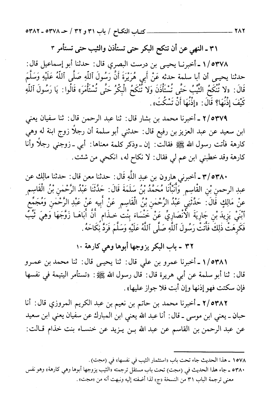 5378 - أخبرنا يحيى بن درست البصري قال حدثنا أبو إسماعيل قال حدثنا يحيى أن أبا سلمة حدثه عن أبي هريرة أن رسول الله صلى الله عليه و سلم قال : لا تنكح الثيب حتى تستأذن ولا تنكح البكر حتى تستأمر قالوا يا رسول الله كيف إذنها قال إذنها أن تسكت