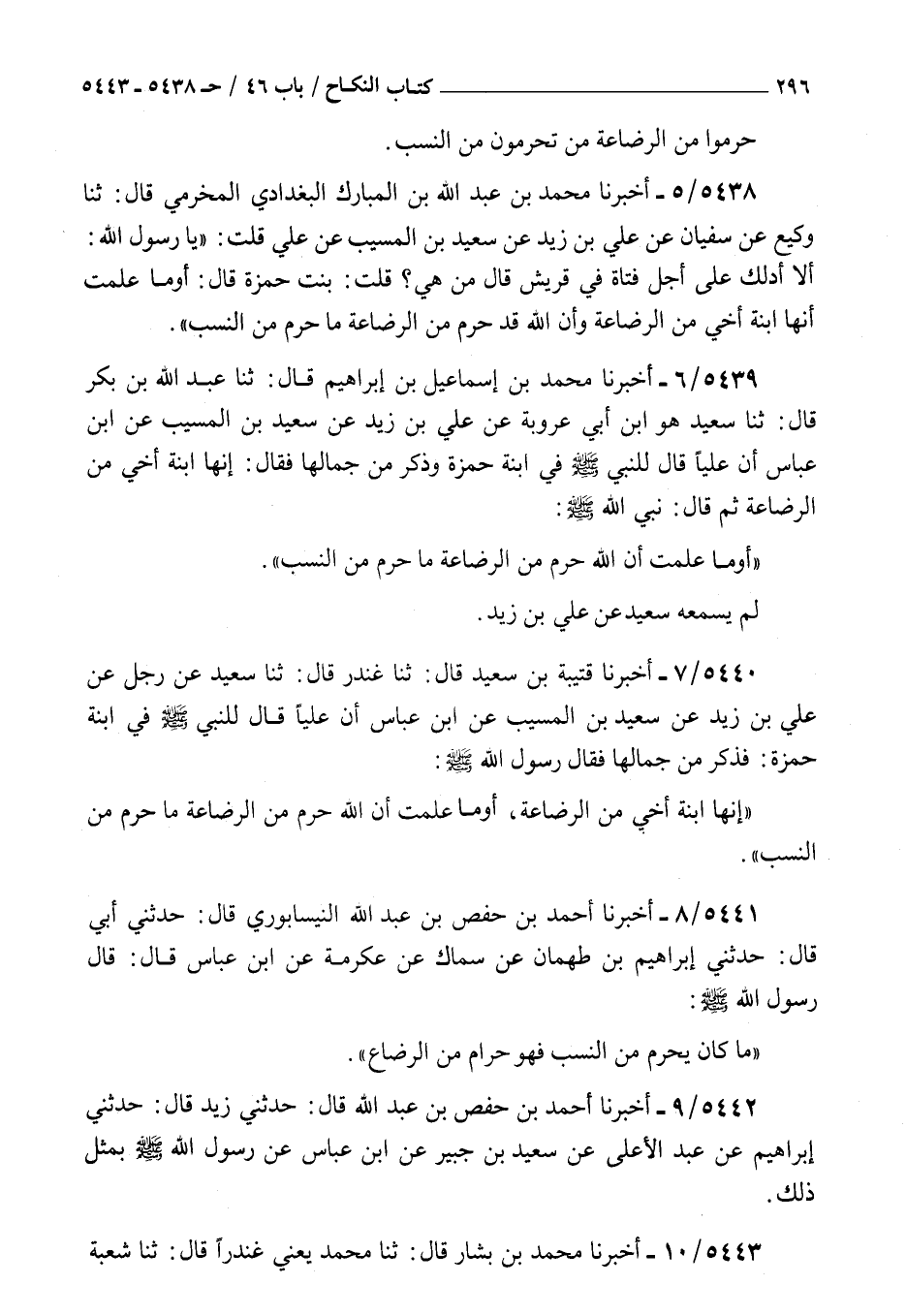 5439 - أخبرنا محمد بن إسماعيل بن إبراهيم قال ثنا عبد الله بن بكر قال ثنا سعيد هو بن أبي عروبة عن علي بن زيد عن سعيد بن المسيب عن بن عباس : أن عليا قال للنبي صلى الله عليه و سلم في ابنة حمزة وذكر من جمالها فقال إنها ابنة أخي من الرضاعة ثم قال نبي الله صلى الله عليه و سلم أوما علمت أن الله حرم من الرضاعة ما حرم من النسب لم يسمعه سعيد عن علي بن زيد