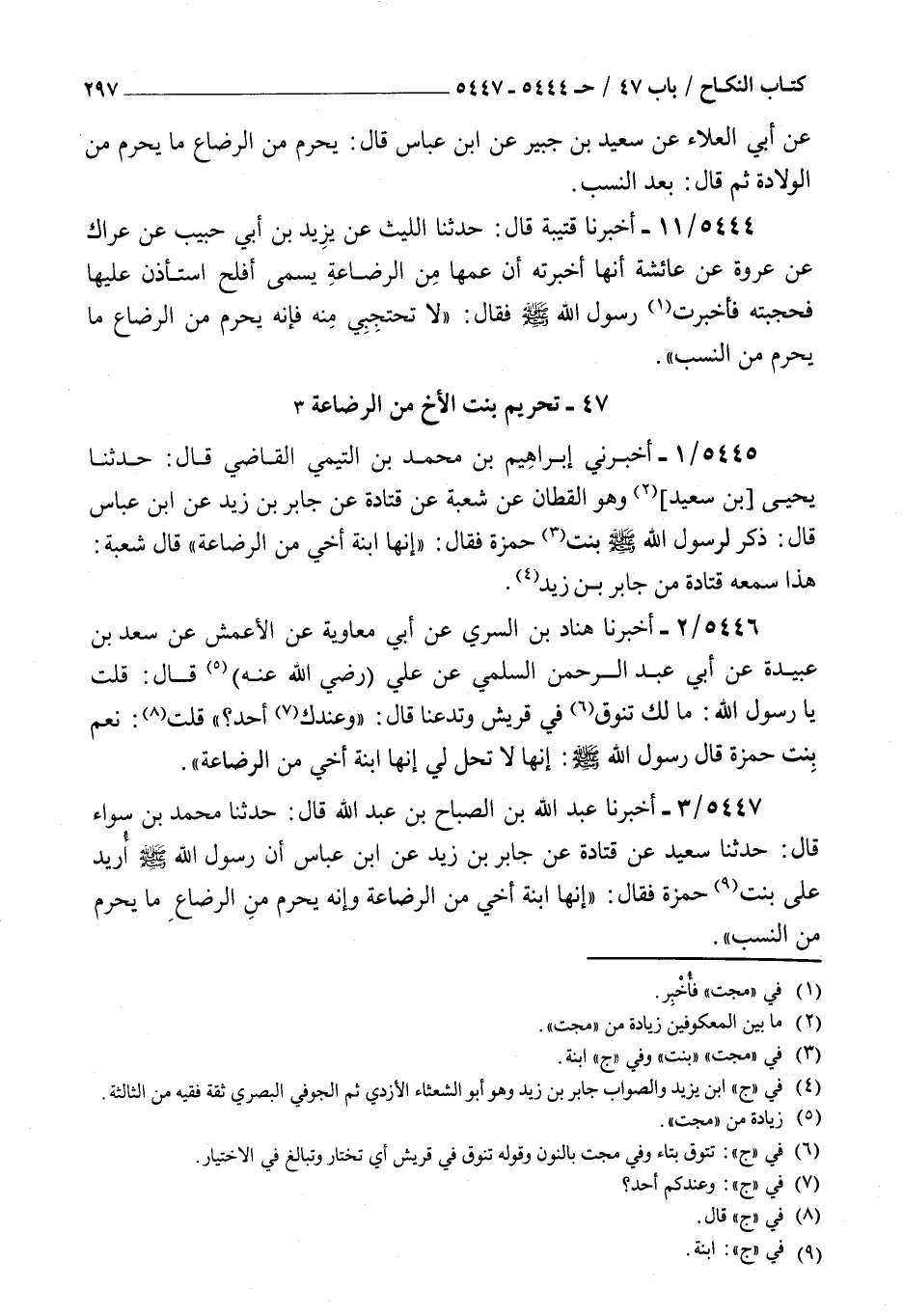 5445 - أخبرني إبراهيم بن محمد بن التيمي القاضي قال حدثنا يحيى بن سعيد وهو القطان عن شعبة عن قتادة عن جابر بن زيد عن بن عباس قال : ذكر لرسول الله صلى الله عليه و سلم بنت حمزة فقال إنها ابنة أخي من الرضاعة قال شعبة هذا سمعه قتادة من جابر بن زيد