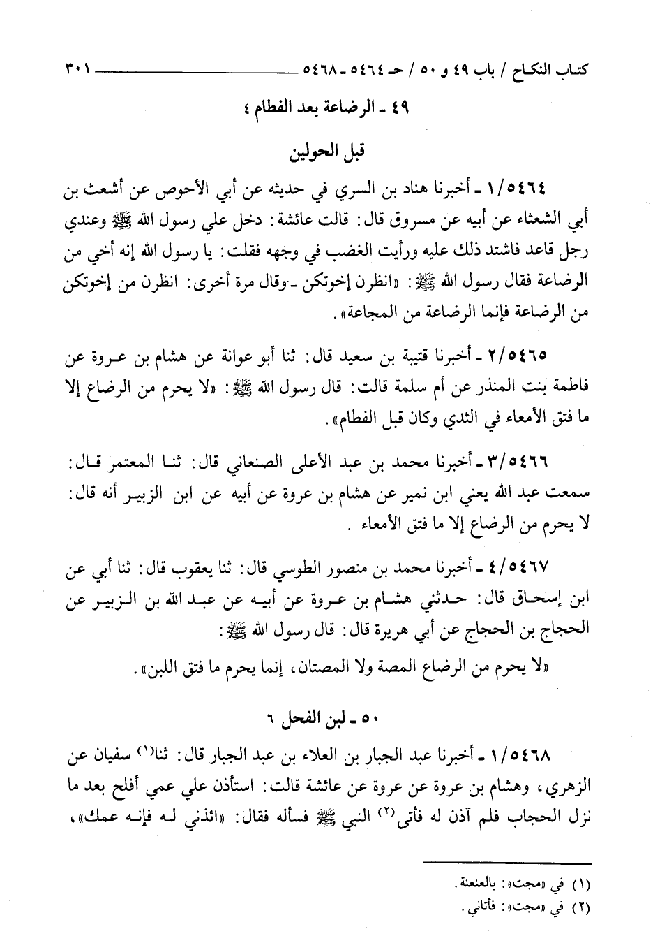 5468 - أخبرنا عبد الجبار بن العلاء بن عبد الجبار قال ثنا سفيان عن الزهري وهشام بن عروة عن عروة عن عائشة قالت : استأذن علي عمي أفلح بعدما نزل الحجاب فلم آذن له فأتى النبي صلى الله عليه و سلم فسأله فقال ائذني له فإنه عمك قلت يا رسول الله إنما أرضعتني المرأة ولم يرضعني الرجل قال ائذني له تربت يمينك فإنه عمك