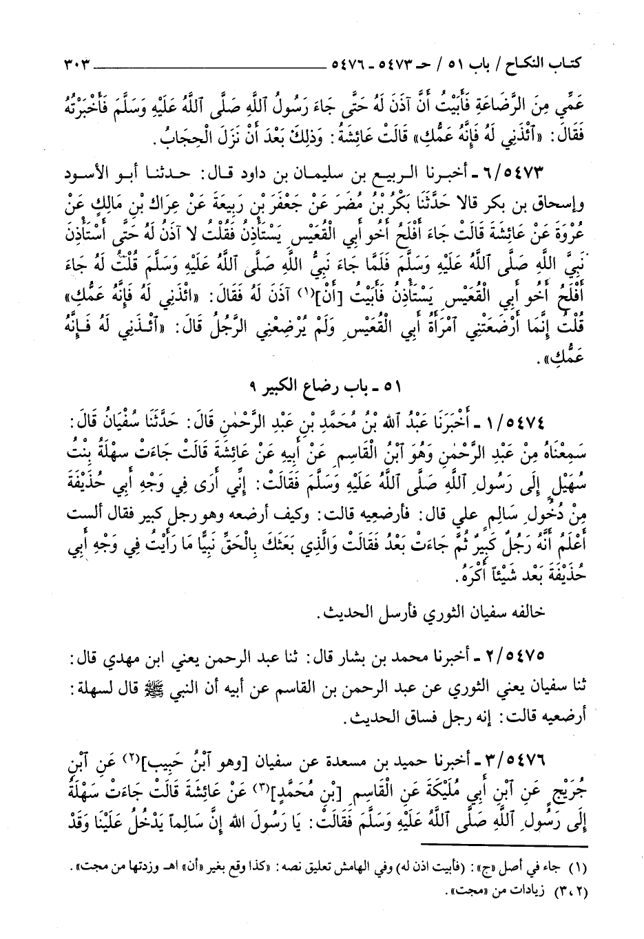5473 - أخبرنا الربيع بن سليمان بن داود قال حدثنا أبو الأسود وإسحاق بن بكر قالا حدثنا بكر بن مضر عن جعفر بن ربيعة عن عراك بن مالك عن عروة عن عائشة قالت : جاء أفلح أخو أبي القعيس يستأذن فقلت لا آذن له حتى استأذن نبي الله صلى الله عليه و سلم فلما جاء نبي الله صلى الله عليه و سلم قلت له جاء أفلح أخو أبي القعيس يستأذن فأبيت أن آذن له فقال ائذني له فإنه عمك قلت إنما أرضعتني امرأة أبي القعيس ولم يرضعني الرجل قال ائذني له فإنه عمك