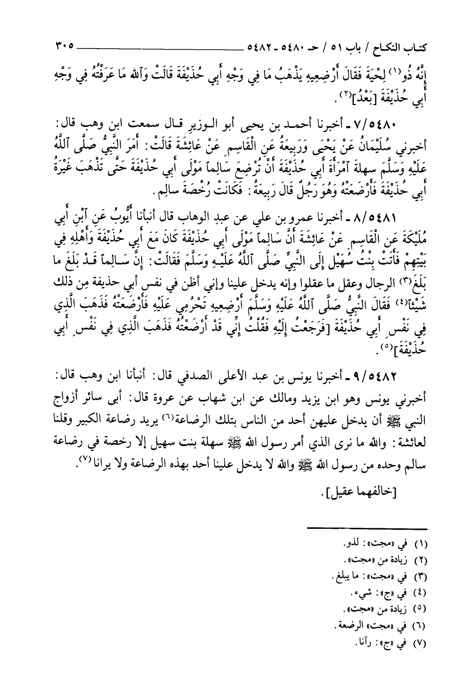 5480 - أخبرنا أحمد بن يحيى أبو الوزير قال سمعت بن وهب قال أخبرني سليمان عن يحيى وربيعة عن القاسم عن عائشة قالت : أمر النبي صلى الله عليه و سلم سهلة امرأة أبي حذيفة أن ترضع سالما مولى أبي حذيفة حتى تذهب غيرة أبي حذيفة فأرضعته وهو رجل قال ربيعة فكانت رخصة سالم
