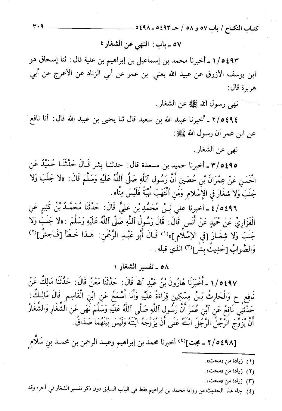 5497 - أخبرنا هارون بن عبد الله قال حدثنا معن قال حدثنا مالك عن نافع ح والحارث بن مسكين قراءة عليه وأنا أسمع عن بن القاسم قال مالك حدثني نافع عن بن عمر : أن رسول الله صلى الله عليه و سلم نهى عن الشغار والشغار أن يزوج الرجل الرجل ابنته على أن يزوجه ابنته على وليس بينهما صداق