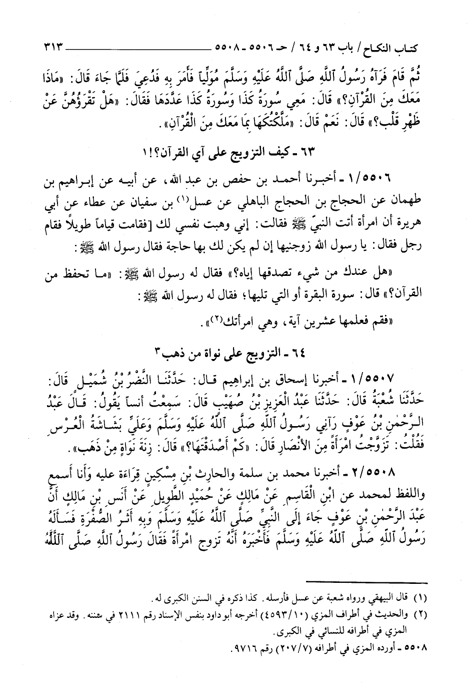 5507 - أخبرنا إسحاق بن إبراهيم قال حدثنا النضر بن شميل قال حدثنا شعبة قال حدثنا عبد العزيز بن صهيب قال سمعت أنسا يقول قال عبد الرحمن بن عوف : رآني رسول الله صلى الله عليه و سلم وعلي بشاشة العرس فقلت تزوجت امرأة من الأنصار قال كم أصدقتها قال زنة نواة من ذهب