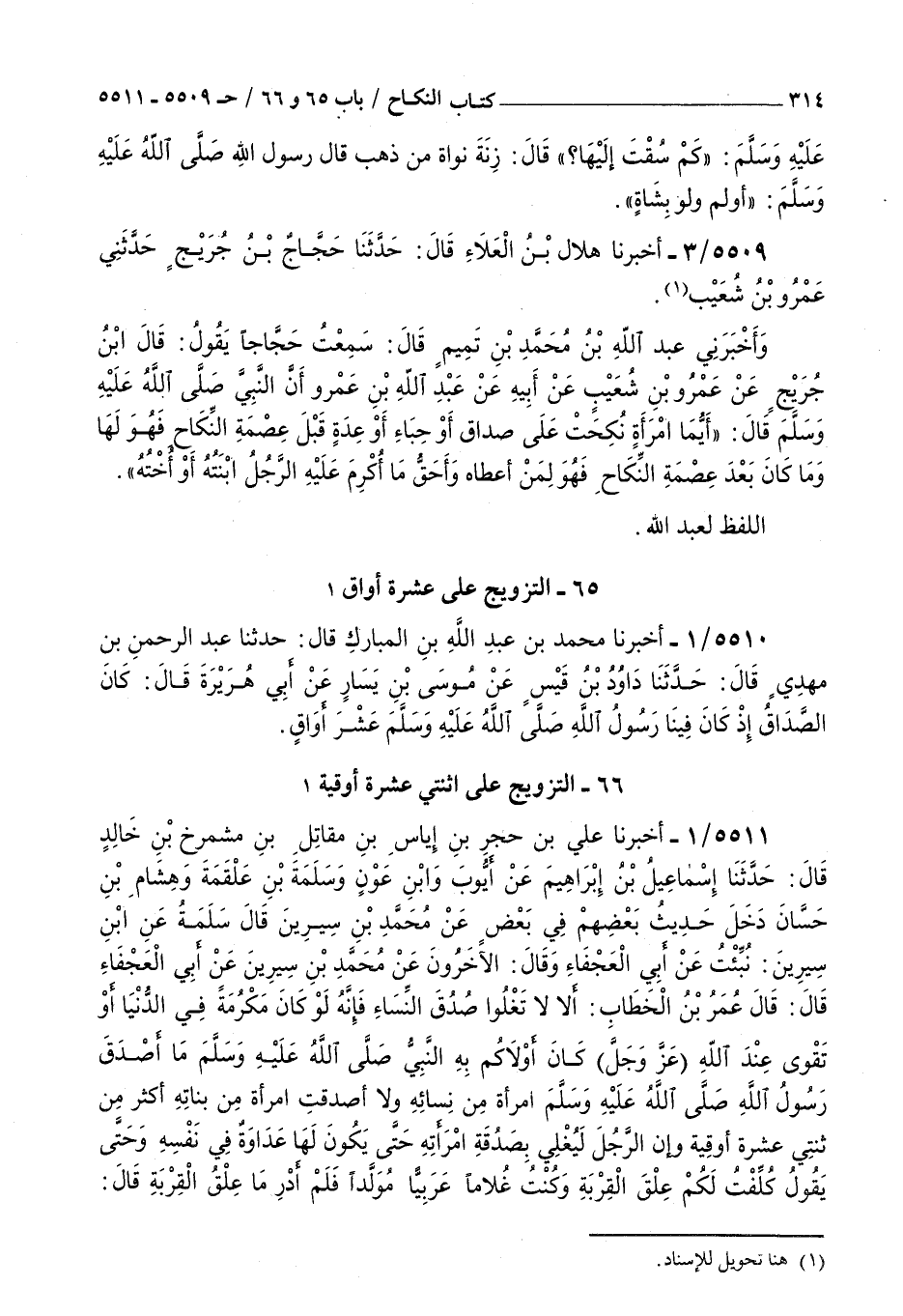 5510 - أخبرنا محمد بن عبد الله بن المبارك قال حدثنا عبد الرحمن بن مهدي قال حدثنا داود بن قيس عن موسى بن يسار عن أبي هريرة قال : كان الصداق إذ كان فينا رسول الله صلى الله عليه و سلم عشر أواق