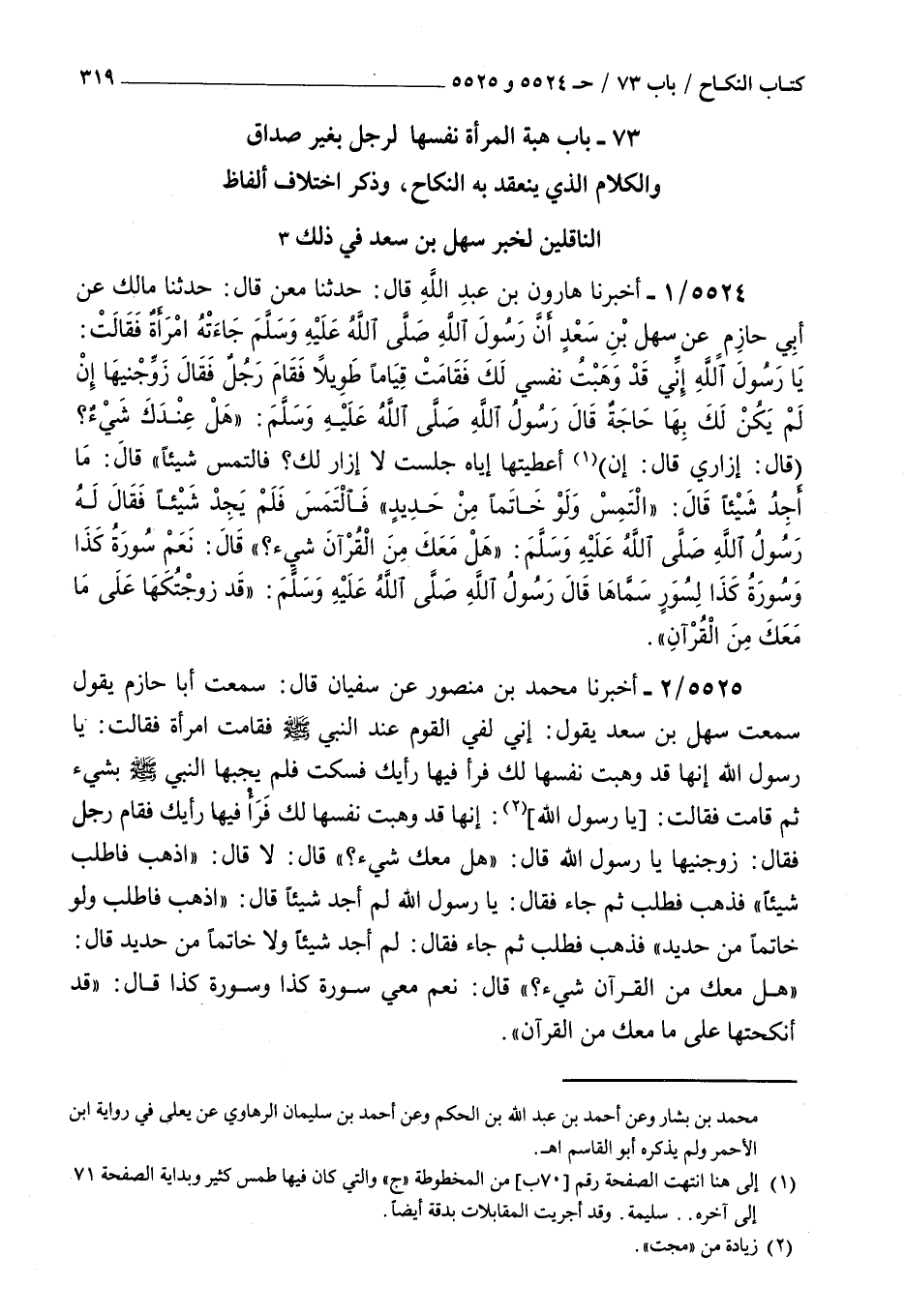 ( 73 باب هبة المرأة نفسها لرجل بغير صداق والكلام الذي ينعقد به النكاح وذكر اختلاف ألفاظ الناقلين لخبر سهل بن سعد في ذلك )