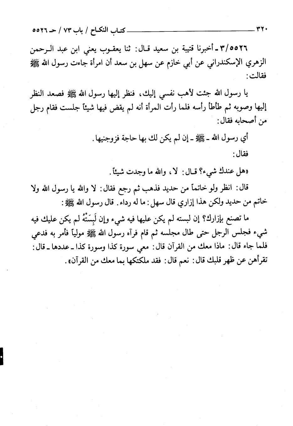 5526 - أخبرنا قتيبة بن سعيد قال ثنا يعقوب يعني بن عبد الرحمن الزهري الإسكندراني عن أبي حازم عن سهل بن سعد أن امرأة جاءت رسول الله صلى الله عليه و سلم فقالت : يا رسول الله جئت لأهب نفسي إليك فنظر إليها رسول الله صلى الله عليه و سلم فصعد النظر إليها وصوبه ثم طأطأ رأسه فلما رأت المرأة أنه لم يقض فيها شيئا جلست فقام رجل من أصحابه فقال أي رسول الله صلى الله عليه و سلم إن لم يكن لك بها حاجة فزوجنيها فقال هل عندك شيء قال لا والله ما وجدت شيئا قال انظر ولو خاتما من حديد فذهب ثم رجع فقال لا والله يا رسول الله ولا خاتم من حديد ولكن هذا إزاري قال سهل ما له أداء قال رسول الله صلى الله عليه و سلم ما تصنع بإزارك إن لبسته لم يكن عليك فيه شيء فجلس الرجل حتى طال مجلسه ثم قام فرآه رسول الله صلى الله عليه و سلم موليا فأمر به فدعي فلما جاء قال ماذا معك من القرآن قال معي سورة كذا وسورة كذا عددها قال تقرأهن عن ظهر قلبك قال نعم قال فقد ملكتكها بما معك من القرآن