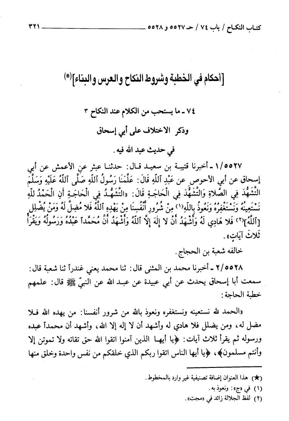 ( 74 ما يستحب من الكلام عند النكاح وذكر الاختلاف على أبي إسحاق في حديث عبد الله فيه )