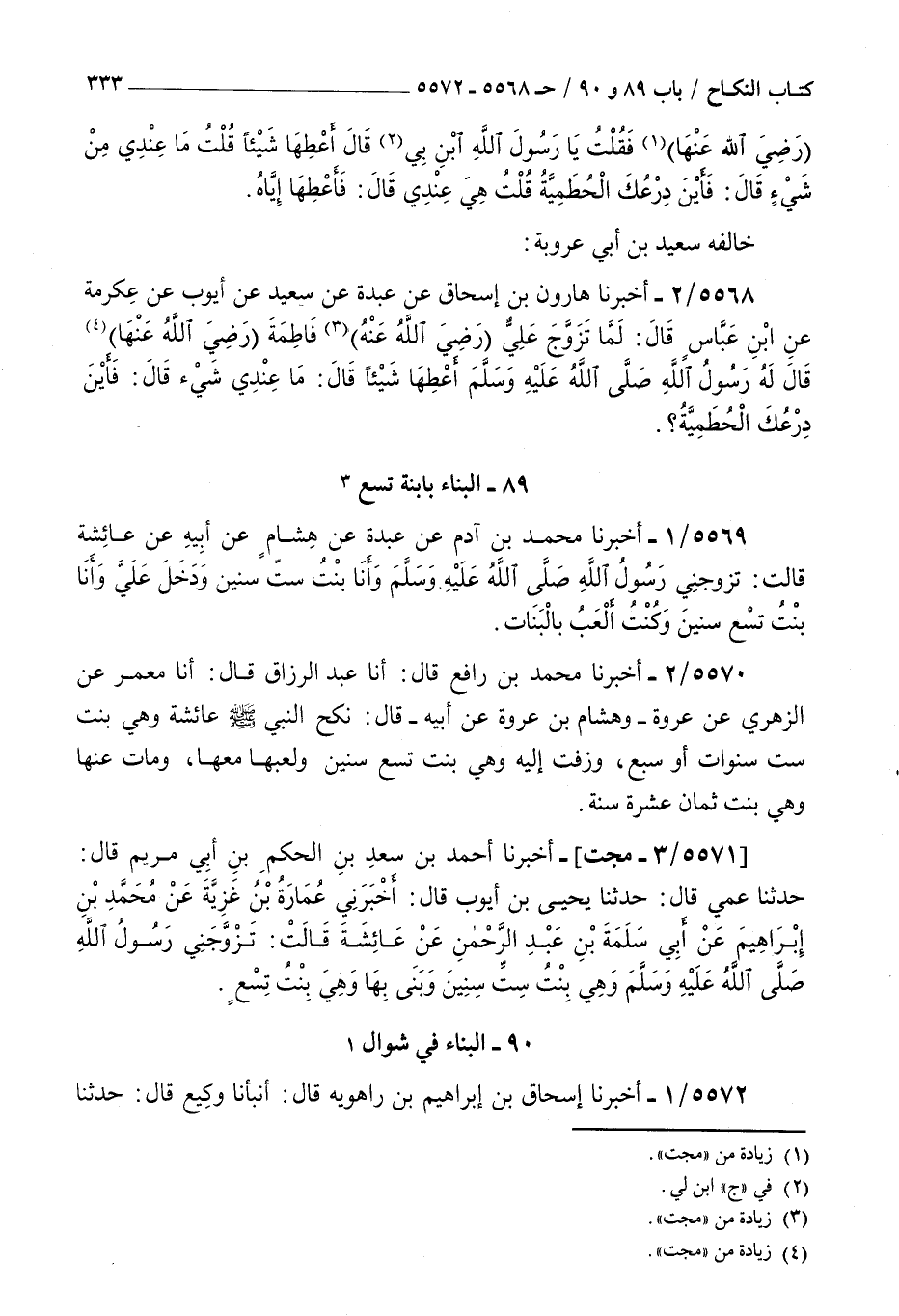 5570 - أخبرنا محمد بن رافع قال أنا عبد الرزاق قال أنا معمر عن الزهري عن عروة وهشام بن عروة عن أبيه قال : نكح النبي صلى الله عليه و سلم عائشة وهي بنت ست سنوات أو سبع وزفت إليه وهي بنت تسع سنين ولعبها معها ومات عنها وهي بنت ثمان عشرة سنة