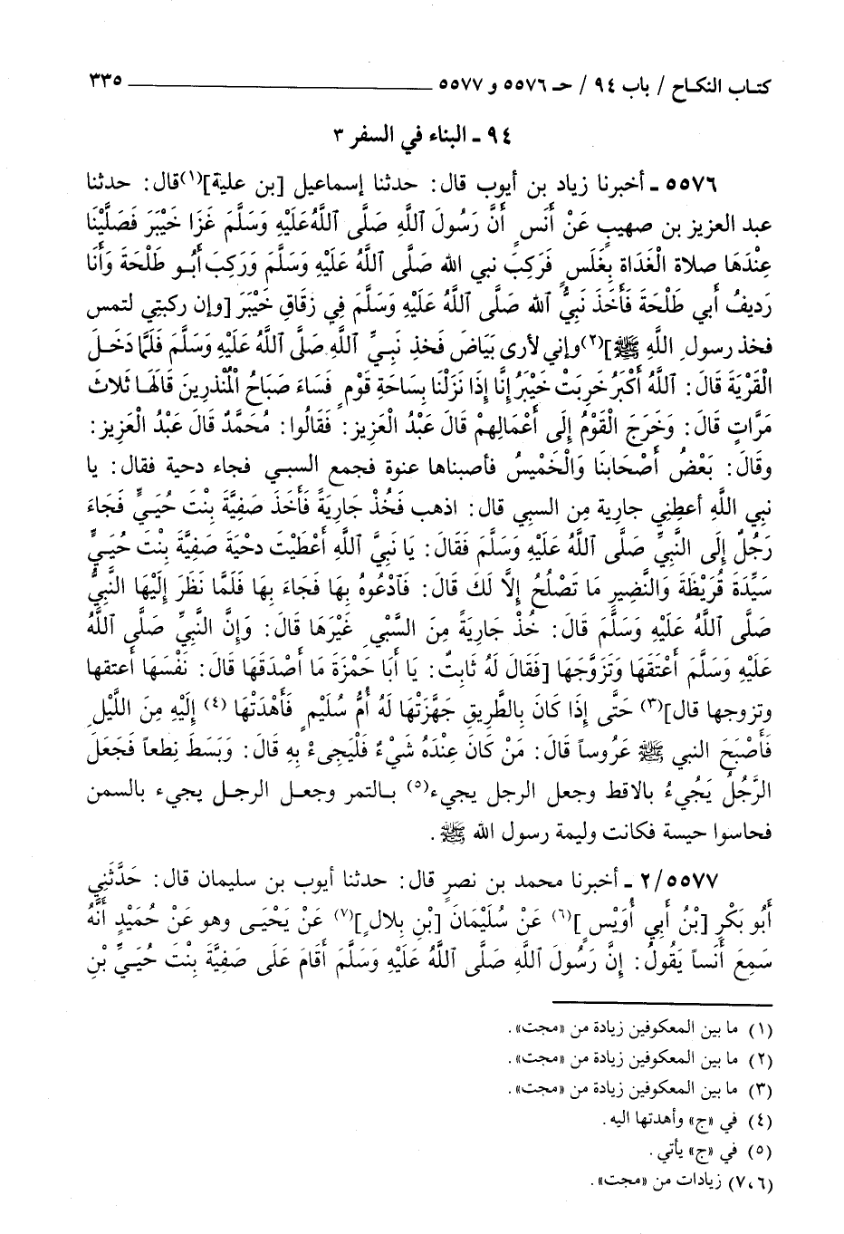 5577 - أخبرنا محمد بن نصر قال حدثنا أيوب بن سليمان قال حدثني أبو بكر بن أبي أويس عن سليمان بن بلال عن يحيى وهو عن حميد أنه سمع أنسا يقول : إن رسول الله صلى الله عليه و سلم أقام على صفية بنت حيي بن أخطب بطريق خيبر ثلاثة أيام حين عرس بها ثم كانت فيمن ضرب عليها الحجاب
