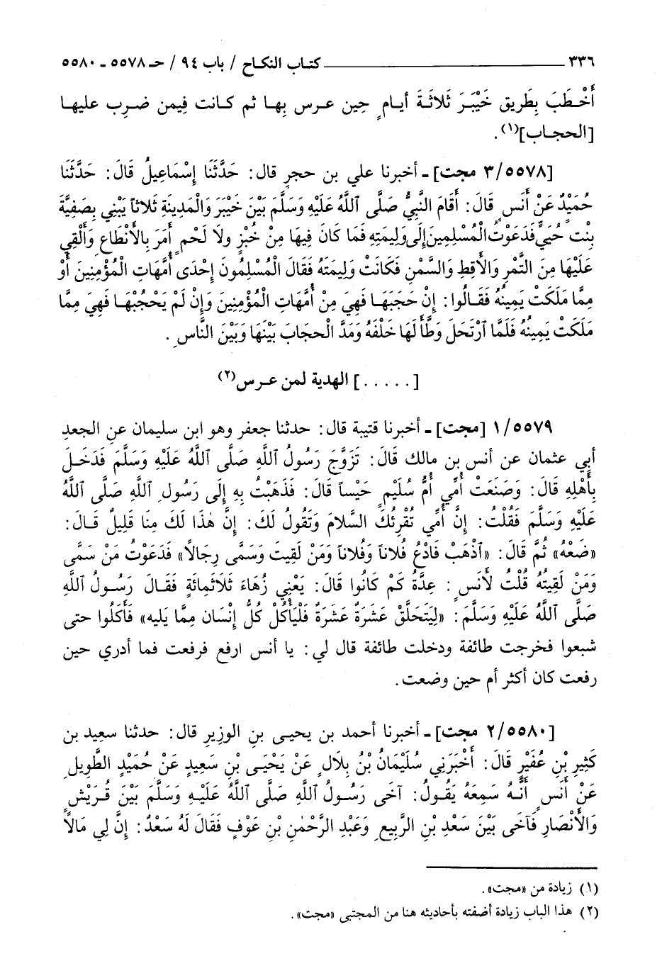 5578 - أخبرنا علي بن حجر قال حدثنا إسماعيل قال حدثنا حميد عن أنس قال : أقام النبي صلى الله عليه و سلم بين خيبر والمدينة ثلاثا يبني بصفية بنت حيي فدعوت المسلمين إلى وليمته فما كان فيها من خبز ولا لحم أمر بالأنطاع وألقي عليها من التمر والأقط والسمن فكانت وليمته فقال المسلمون إحدى أمهات المؤمنين أو مما ملكت يمينه فقالوا إن حجبها فهي من أمهات المؤمنين وإن لم يحجبها فهي مما ملكت يمينه فلما ارتحل وطأ لها خلفه ومد الحجاب بينها وبين الناس